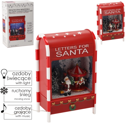 Táto dekoratívna červená schránka je pôsobivým vianočným doplnkom s bohatými vizuálnymi aj zvukovými efektmi. Studené biele SMD LED podčiarkujú zimnú atmosféru, zatiaľ čo scéna so Santa Clausom, stromčekmi a kolotočom vytvára kúzelný pohyblivý výjav. Funkcia efektu sneženia dodáva dekorácii autentickú sviatočnú náladu.