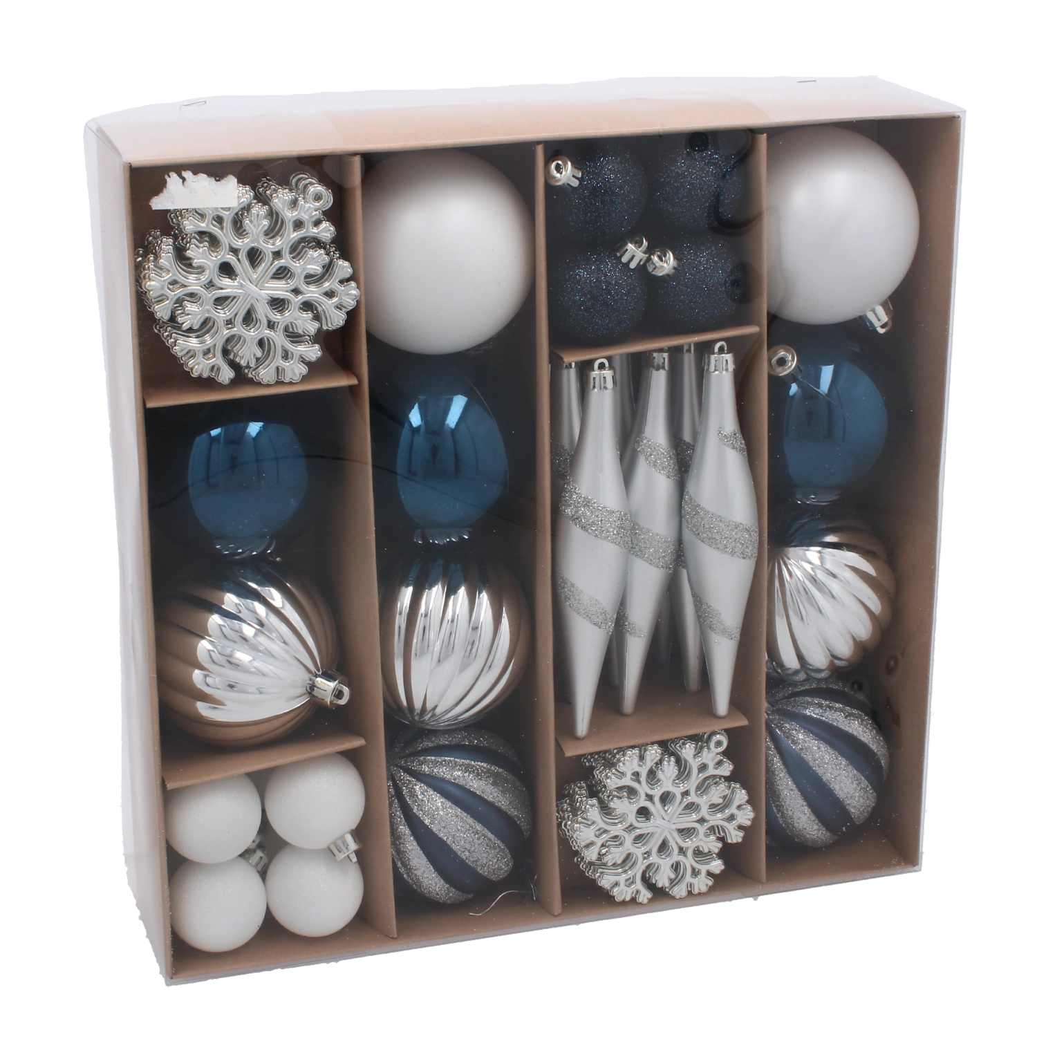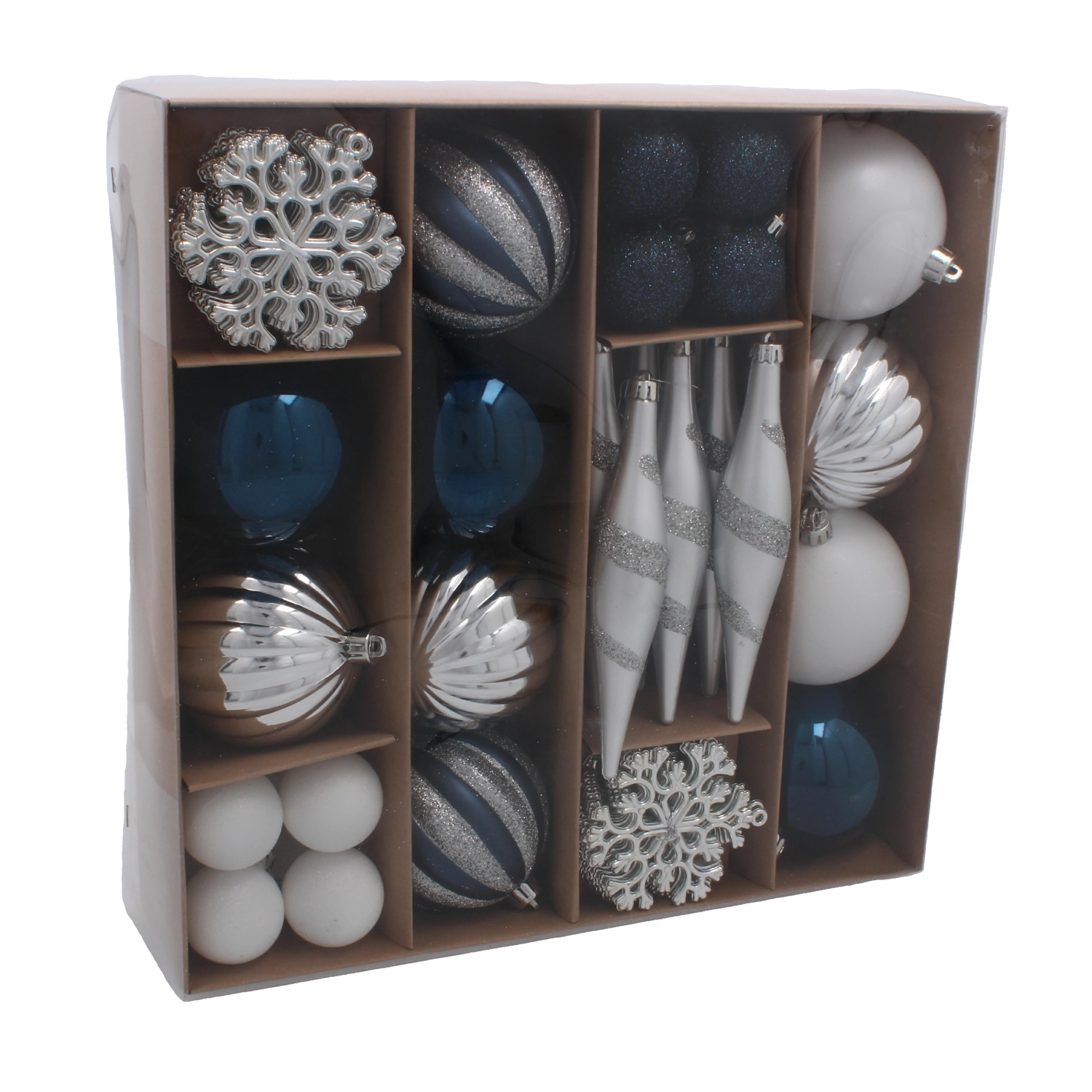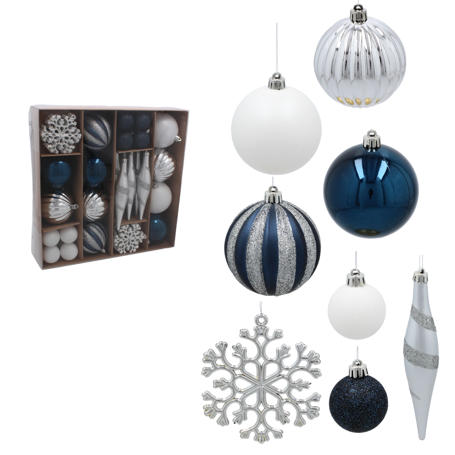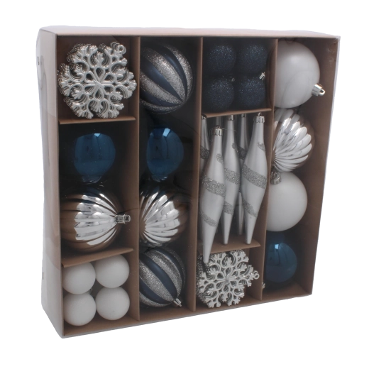 Elegantná súprava 50 vianočných ozdôb v odtieňoch námorníckej modrej a striebra dodá vašej vianočnej výzdobe moderný šmrnc a harmóniu. Ozdoby sú z nerozbitného plastu, bezpečné pre domácnosti s deťmi aj miláčikmi, a vďaka ľahkej konštrukcii sa ľahko zavesujú na malé aj veľké stromčeky. Rôzne tvary – od klasických gulí po šišky – umožnia vytvoriť štýlovo zladenú dekoráciu. Dodávané v darčekovom boxe vhodnom aj ako pekný darček.