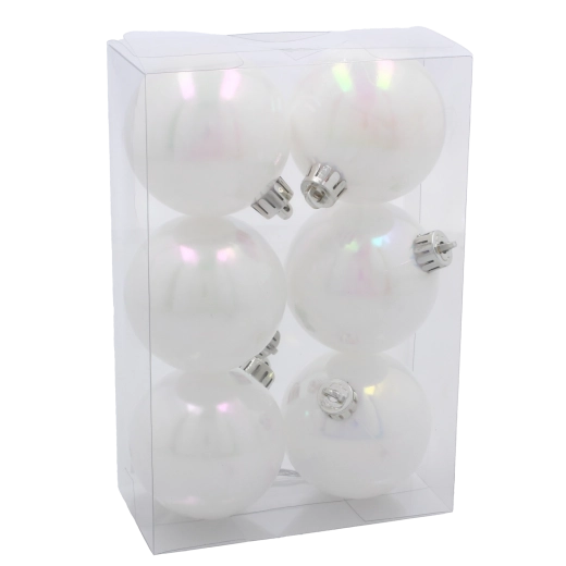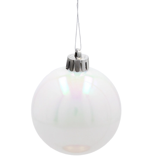 Vyladte vianočné dekorácie do posledného detailu. Perleťovo biele gule s priemerom 6 cm prinášajú harmóniu, nadčasovú eleganciu a jemný odlesk svetla, ktorý podčiarkne krásu vášho stromčeka aj ďalších sviatočných aranžmánov. Vďaka odolnému plastu sú vhodné do domácností s deťmi či domácimi miláčikmi.