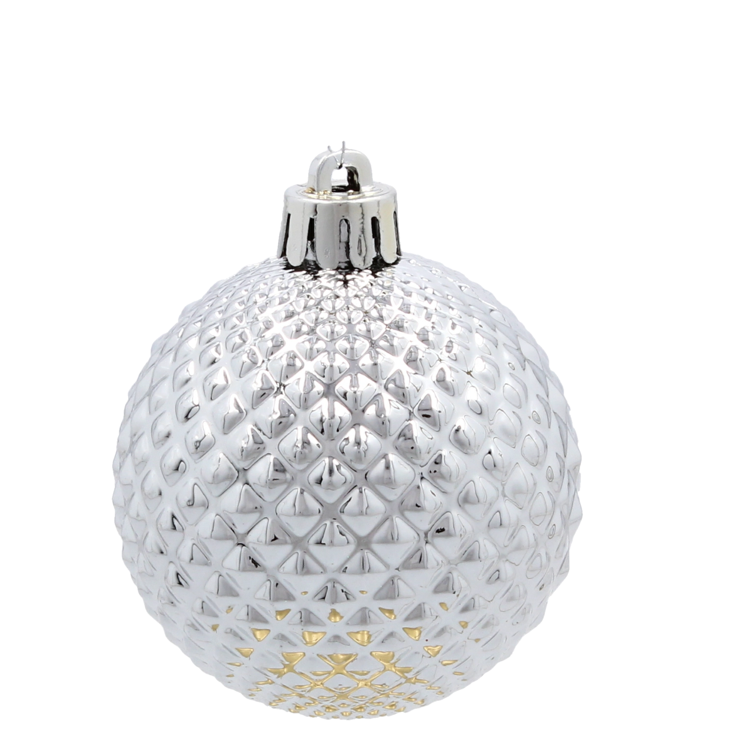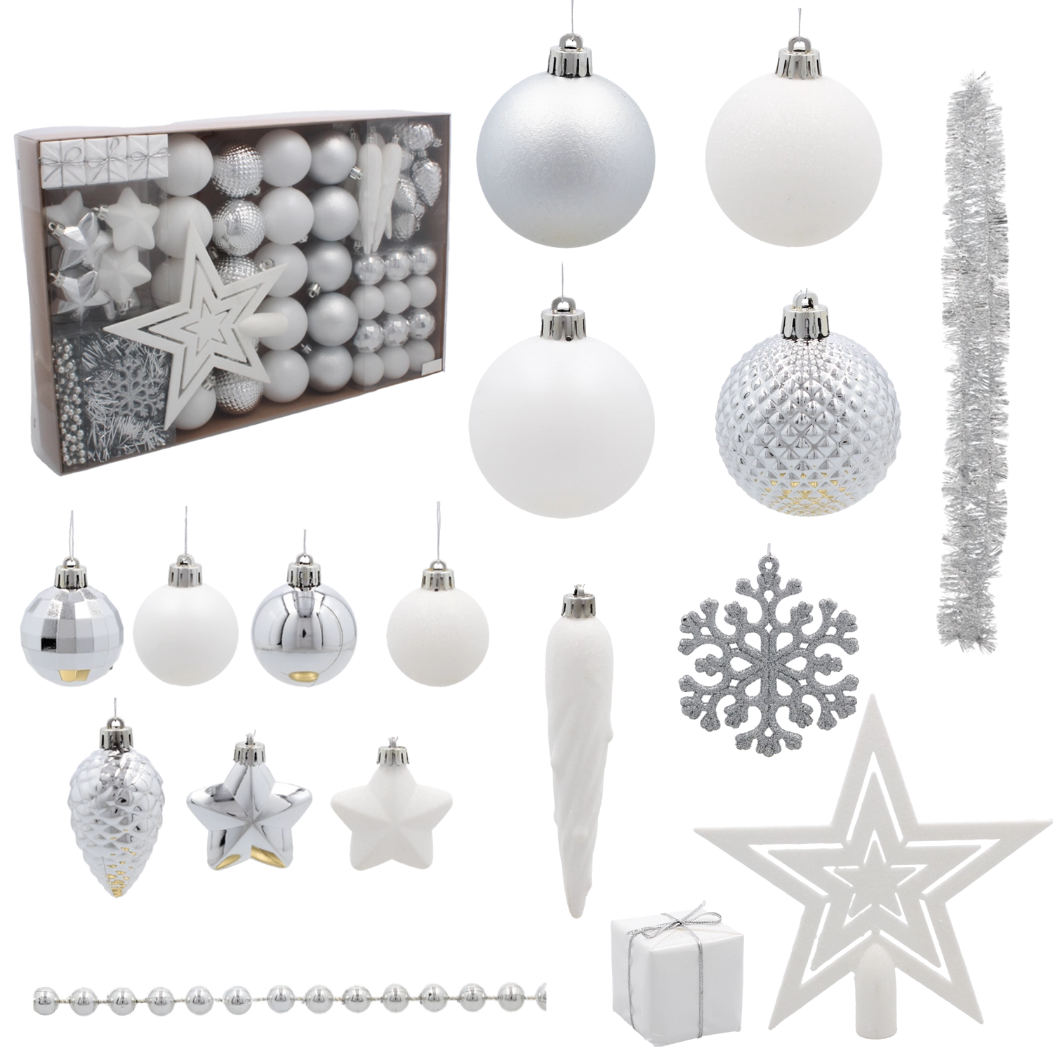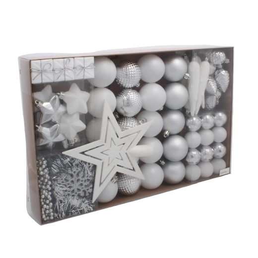 Táto univerzálna sada ozdôb v bielej a striebornej farbe sa skvele hodí k tradičným aj moderným dekorom. Mix povrchov – mat, lesk, trblietky a fazetové štruktúry – zabezpečuje krásne odlesky svetla a vizuálnu hĺbku. Vďaka 60 kusom jednoducho ozdobíte celý stromček aj doplnkové dekorácie.
