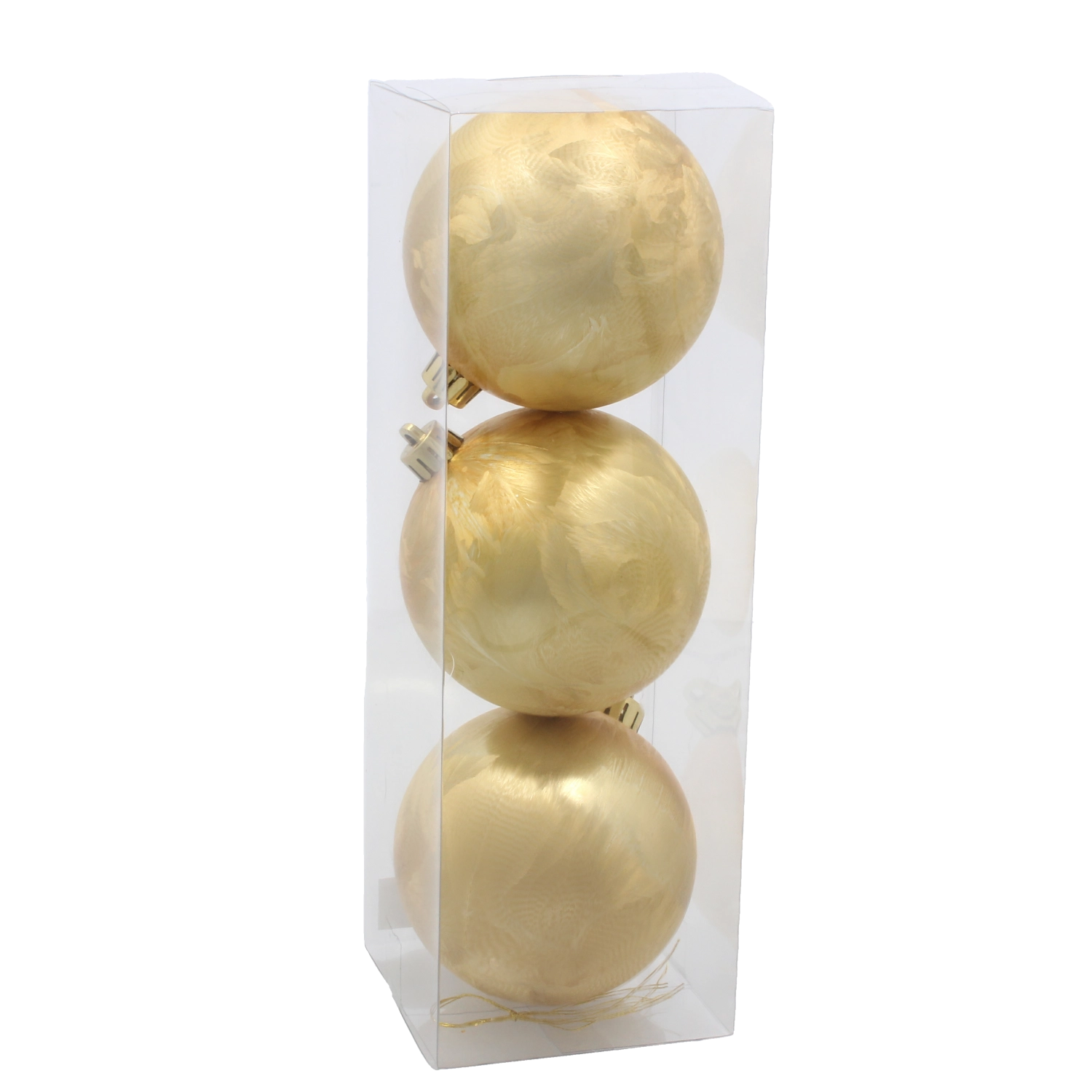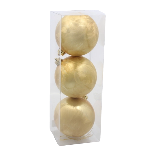 Každá guľa je vybavená pevným zlatým závesom pre rýchle zavesenie na vetvy alebo háčiky. Balenie po 3 kusoch je perfektné ako doplnkový set k vašej existujúcej výzdobe alebo ako základ novej dekorácie.