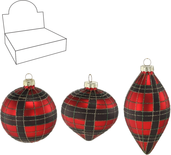 Dotiahnite svoju vianočnú výzdobu do posledného detailu. Tieto sklenené ozdoby v červenej a čiernej farbe s kockovaným motívom dodajú stromčeku výrazný, no vkusný akcent. Lesklý povrch a precízne farebné prevedenie zabezpečia, že sa ozdoby stanú neprehliadnuteľnou súčasťou sviatočnej atmosféry.