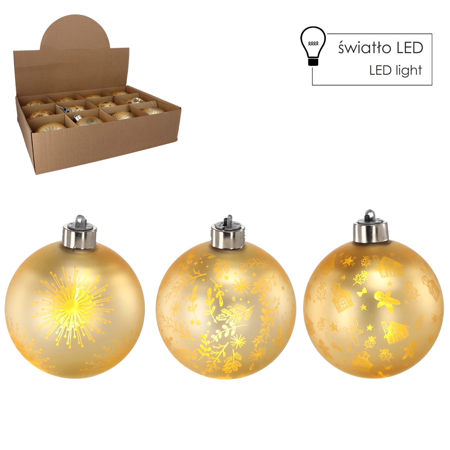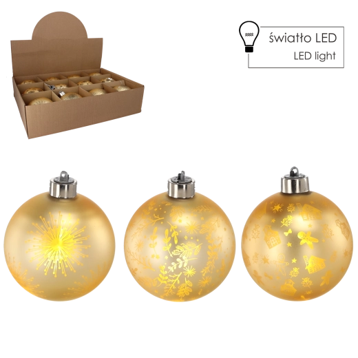 Táto zlatá vianočná guľa zo skla vytvára vďaka jemnému LED osvetleniu útulné, teplé svetlo, ktoré podčiarkne sviatočnú náladu. Zdobený povrch po rozsvietení krásne vynikne a dodá priestoru luxusný vzhľad. Vďaka univerzálnej zlatej farbe ju ľahko skombinujete s červenými, zelenými aj bielymi dekoráciami.
