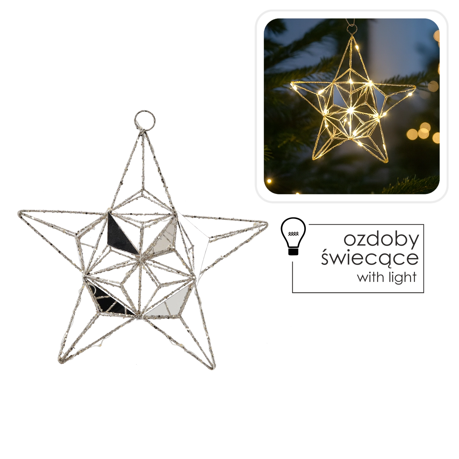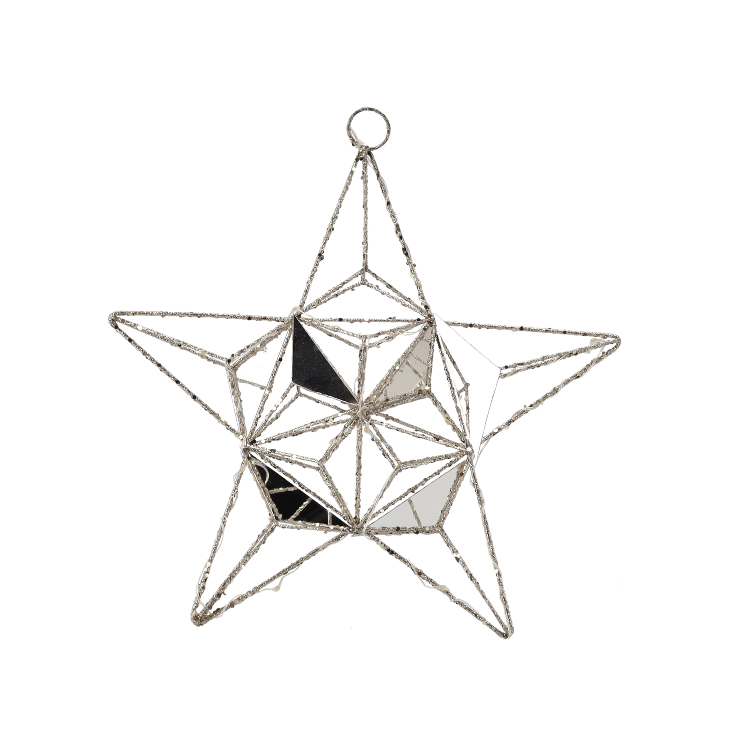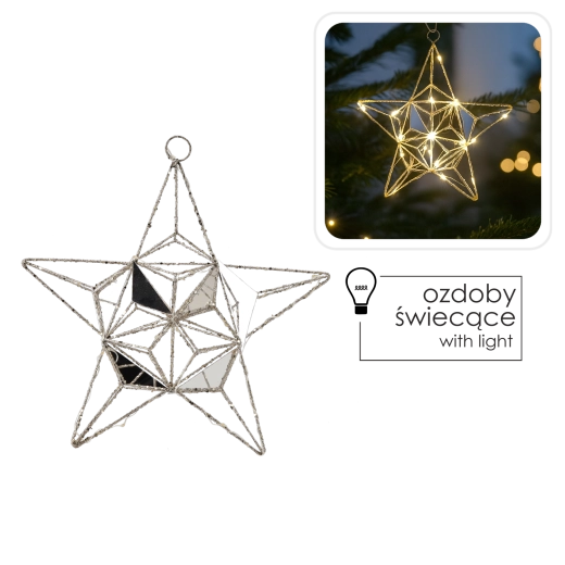 Táto elegantná vianočná hviezda s integrovanými energeticky úspornými LED diódami vykúzli útulnú atmosféru a jemný trbliet. Kovová drôtená konštrukcia s fazetovanými prvkami a zrkadlovými plochami odráža svetlo a dodáva dekorácii luxusný vzhľad.