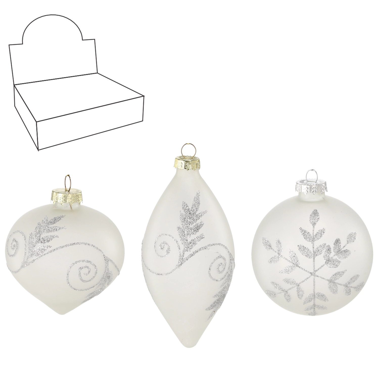 Elegantné sklenené vianočné ozdoby v bielej matnej farbe dodajú stromčeku aj interiéru nádych zimnej čistoty a luxusu. V balení nájdete mix vzorov, ktoré sa navzájom krásne dopĺňajú. Ozdoby majú precízne spracovanie a decentný dekor, takže skvelo ladia k modernému aj tradičnému štýlu. Vyberte si z kombinácie guľatých a podlhovastých tvarov pre harmonickú výzdobu. Sklenené prevedenie, biela matná povrchová úprava, mix vzorov a rôzne tvary pre pútavý efekt na stromčeku.