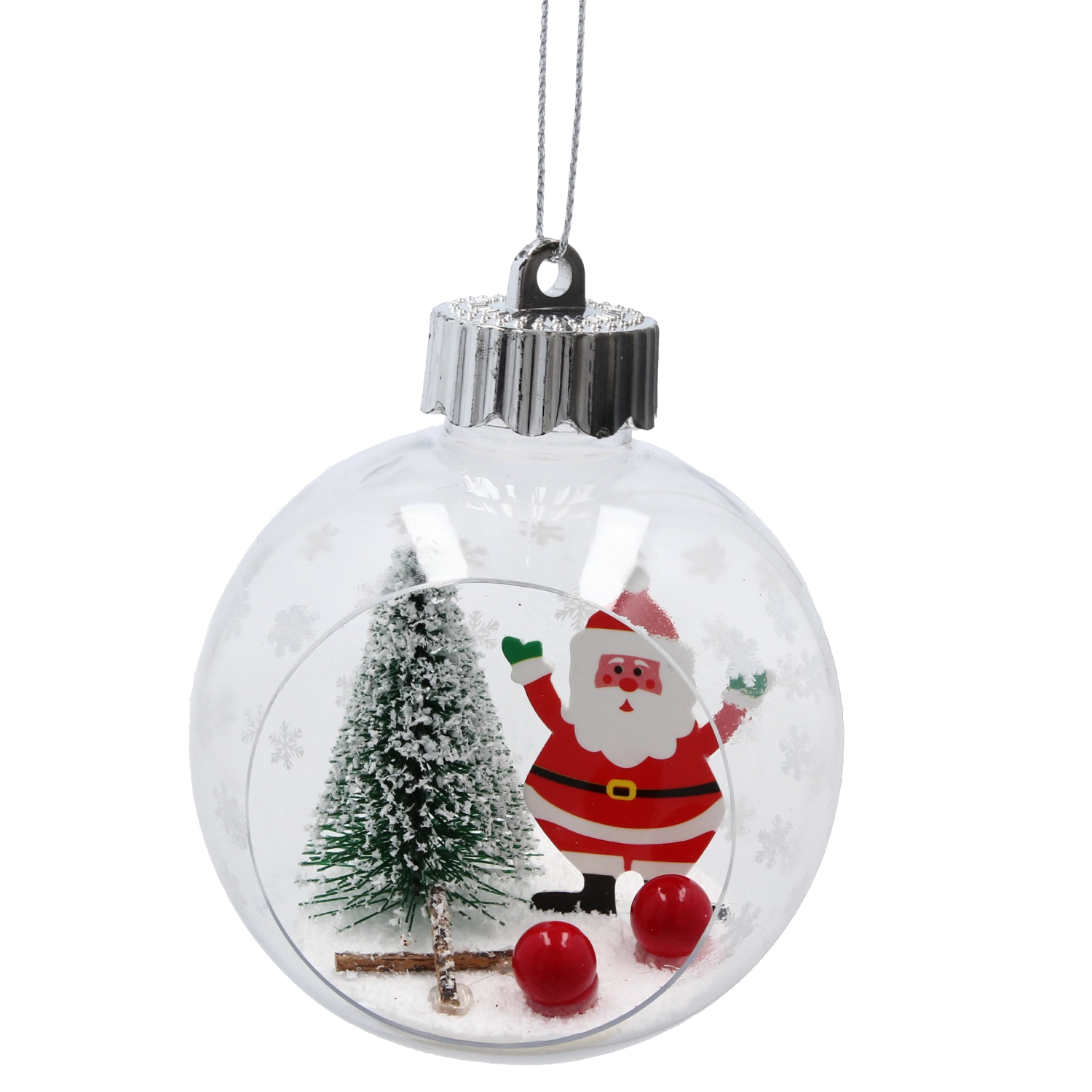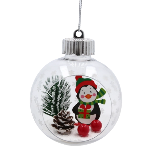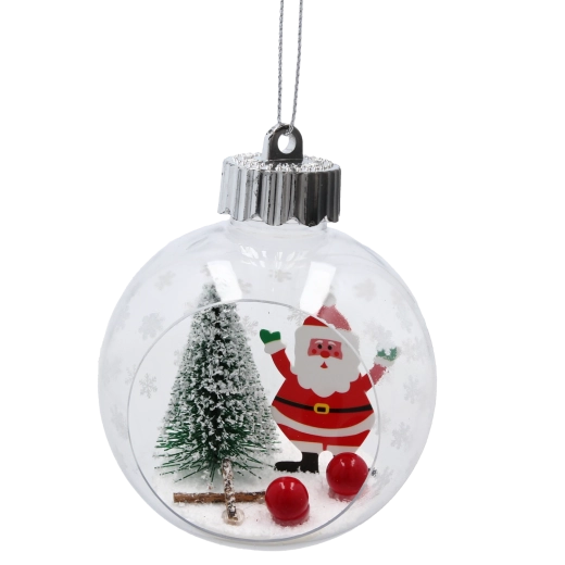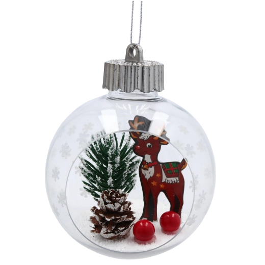 Táto vianočná ozdoba v tvare čírej gule so strieborným závesom v sebe ukrýva drobnú zimnú scénu – snehom poprášený stromček, šišku, červené bobule a postavičku podľa vybraného motívu. Kombinácia skla a ľahkého plastu zabezpečuje nízku hmotnosť, bezpečné zavesenie a dlhú životnosť. Každý kúsok je precízne spracovaný s dôrazom na detail, aby vytváral autentickú sviatočnú náladu.