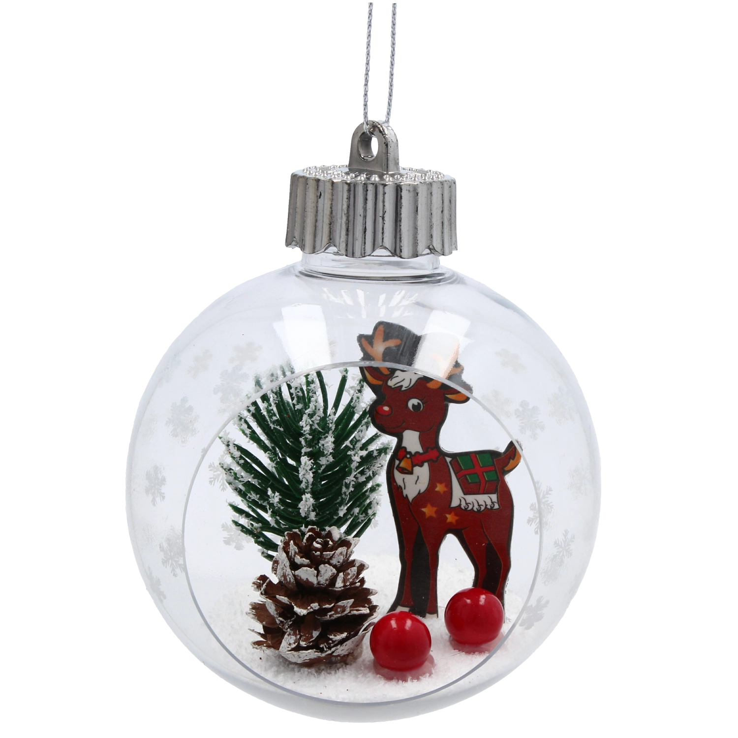 Číra guľa odhaľuje zasnežený stromček, šišku a červené bobule doplnené postavičkou. Okamžite vytvorí hrejivú sviatočnú atmosféru.