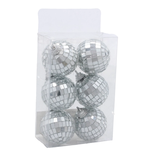 Dajte svojej sviatočnej výzdobe svieži lesk so súpravou šiestich strieborných gúľ v štýle disco. Zrkadlový efekt odráža okolité svetlo a vytvára trblietavú atmosféru, ktorá vynikne na vianočnom stromčeku, vencoch aj v stolových dekoráciách.