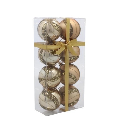 Vďaka rôznorodým vzorom vytvoríte nápadité kombinácie a ľahko dosiahnete vyvážený vzhľad stromčeka či ďalších aranžmánov. Lesklé aj dekoratívne zdobené povrchy odrážajú svetlo a prinášajú do interiéru teplý zlatý nádych.