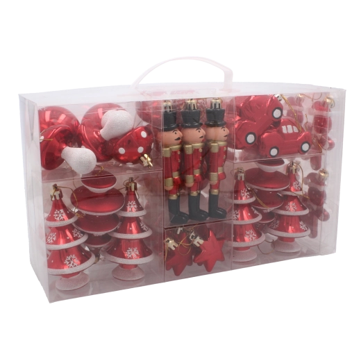 Dodejte svojmu stromčeku šmrnc so súpravou 50 odolných vianočných ozdôb v červenej, striebornej a zlatej. Rôzne tvary a veľkosti 5–10 cm vytvárajú harmonický, slávnostný vzhľad, zatiaľ čo ľahké a bezpečné plastové prevedenie a šnúrky na jednoduché zavesenie zaručia pohodlnú výzdobu bez starostí.