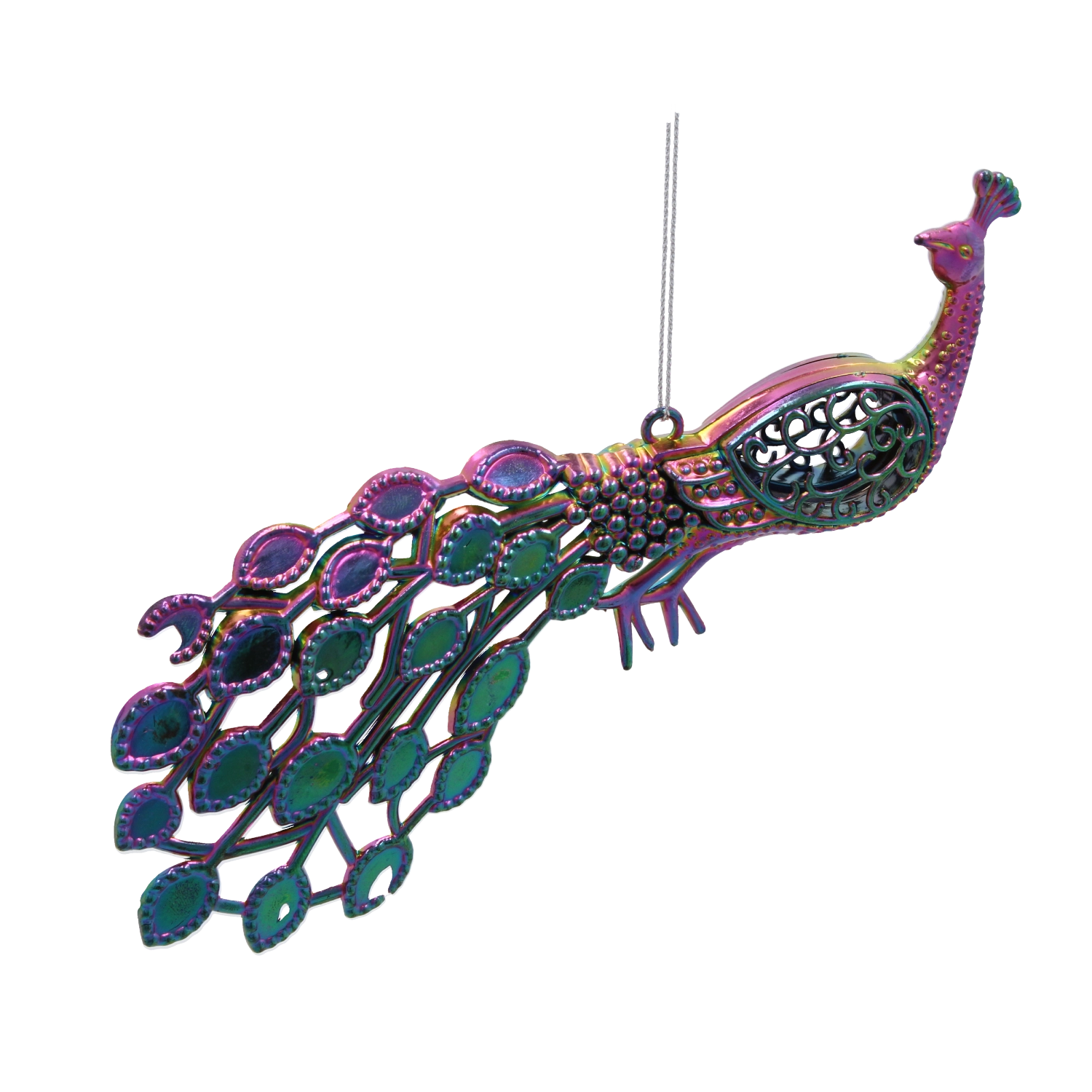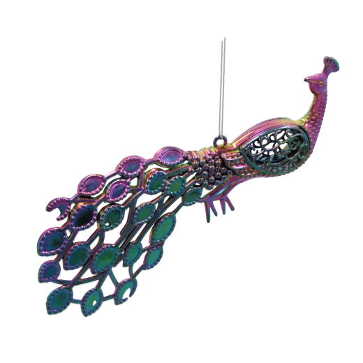Elegantná vianočná ozdoba v tvare páva dodá vašej výzdobe jedinečný lesk a sofistikovaný vzhľad. Špeciálny povrch s dúhovým efektom pripomínajúcim odlesky benzínu sa mení podľa uhla svetla a vytvára očarujúce farebné prechody. Ľahký a odolný plastový materiál a praktický klip umožnia jednoduché upevnenie na vetvy stromčeka, girlandy, vence aj stolové dekorácie.