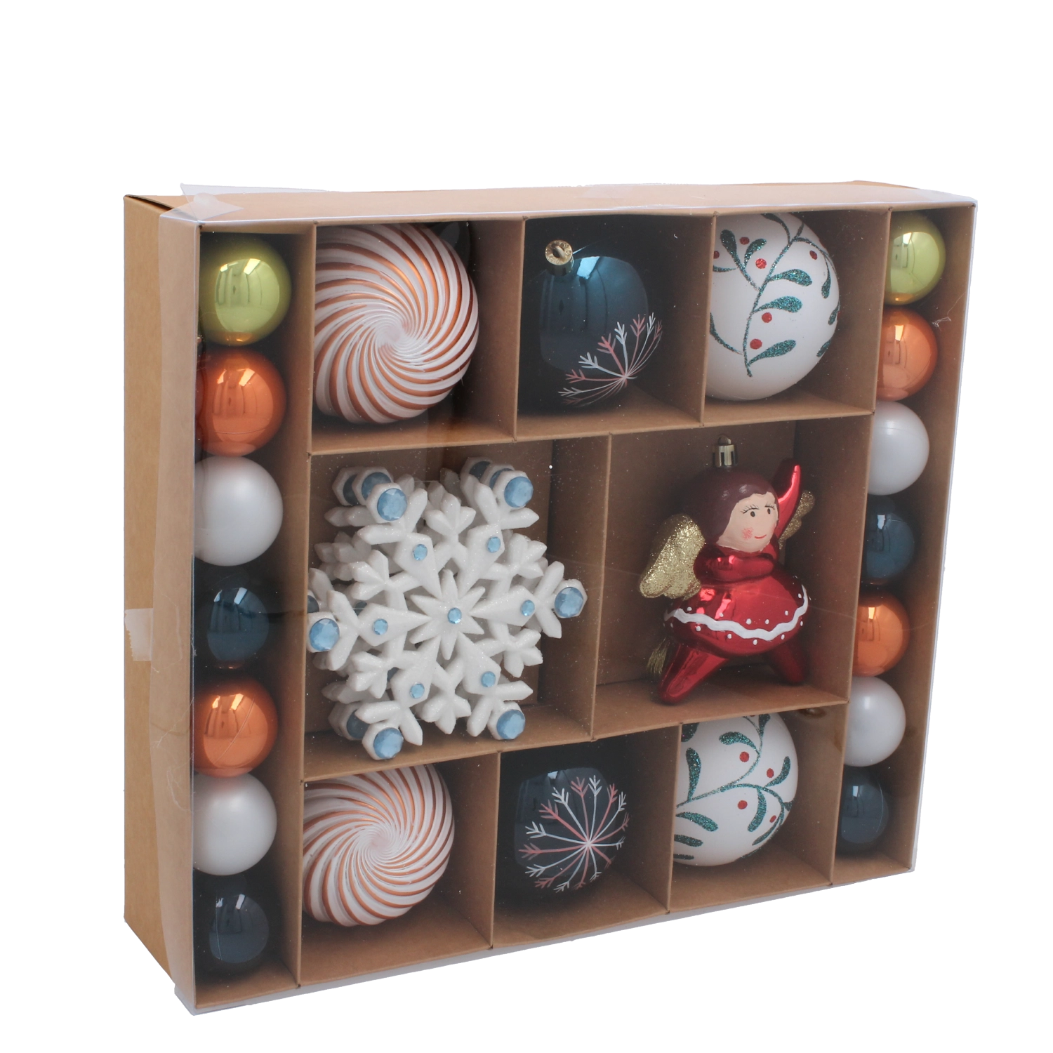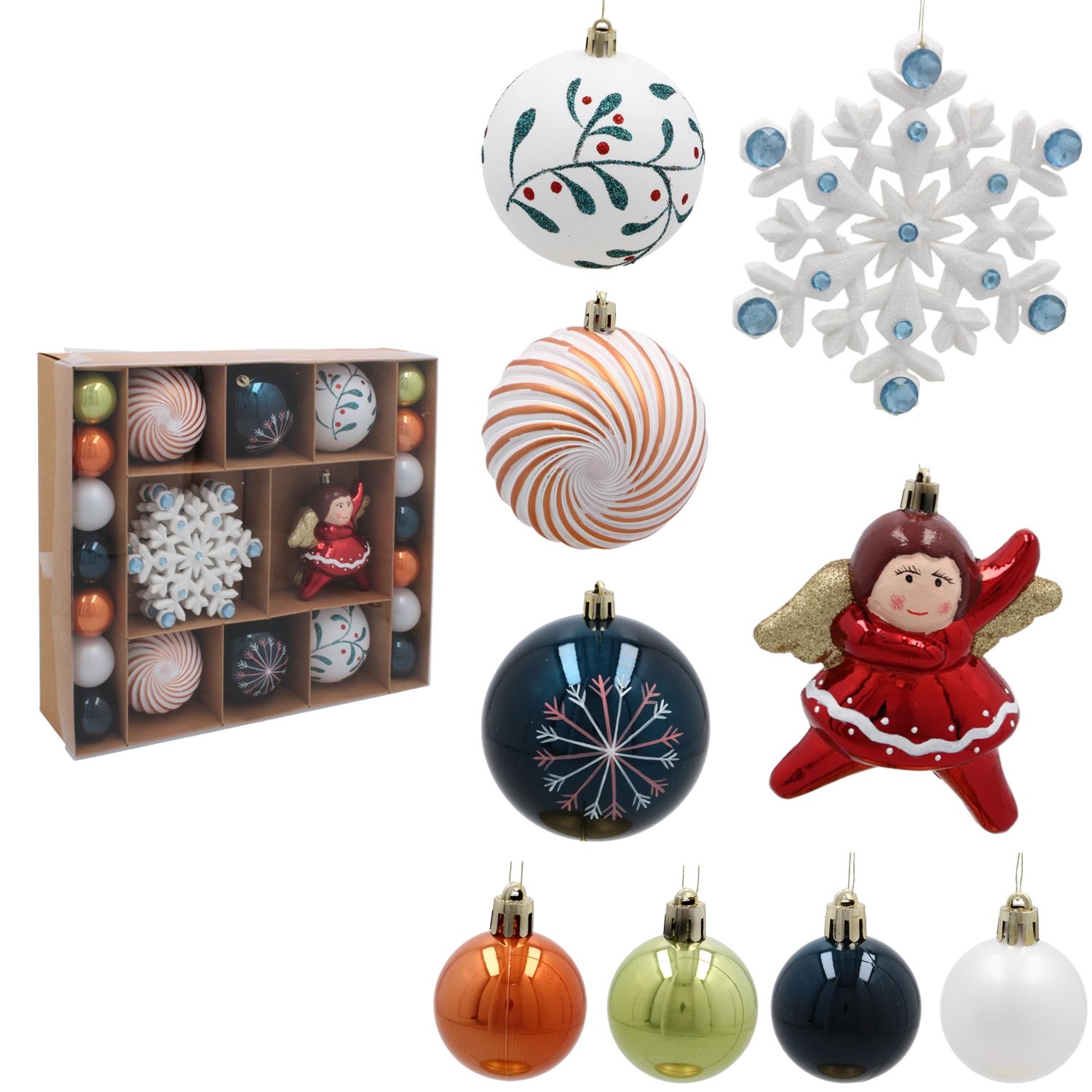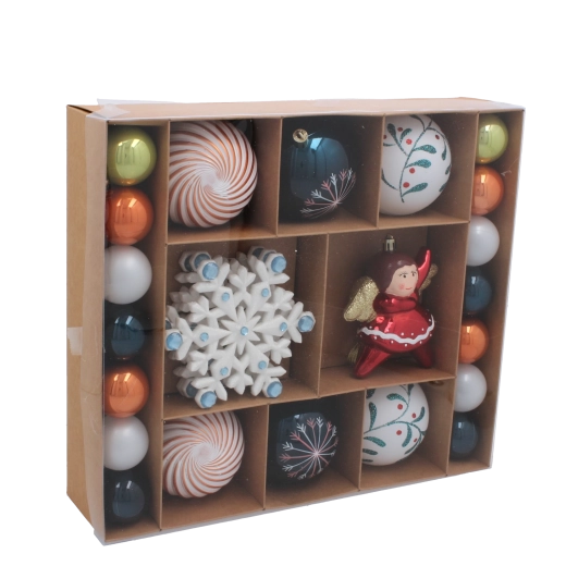 Obohaťte svoj stromček o čarovnú sviatočnú atmosféru so sadou 38 vianočných ozdôb v pestrenom mixe farieb a tvarov. Ľahký a odolný plast zabezpečuje bezpečné zavesenie bez zaťaženia vetiev, zatiaľ čo rôznorodé tvary a veľkosti dodajú dekorácii hĺbku a iskru.