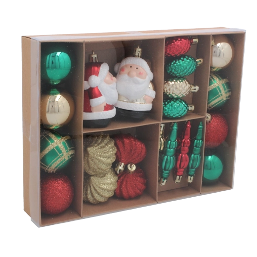 Rozžiarte svoj stromček štýlovou sadou 24 kusov vianočných ozdôb v klasických farbách červenej, zelenej a zlatej. Ľahký a odolný plast zaručuje bezpečné používanie aj dlhú životnosť, zatiaľ čo trblietavé detaily a rôzne tvary ako gule, šišky či špice dodajú výzdobe elegantný sviatočný vzhľad. Každý kus má závesnú šnúrku na jednoduché umiestnenie na stromček.