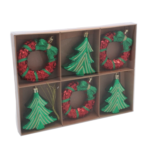 Doprajte svojmu stromčeku sviatočný šmrnc so sadou šiestich vianočných ozdôb v tvare venca a stromčeka s priemerom 8 cm. Ľahký a odolný plast zabezpečí jednoduché zavesenie bez zaťaženia konárov, zatiaľ čo lesklé a trblietavé detaily vykúzlia harmonický a elegantný vzhľad celej výzdoby.