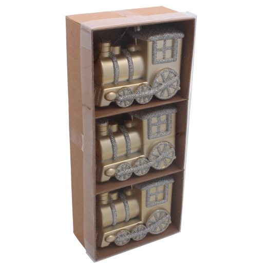 Dodajte svojmu stromčeku čaro Vianoc so setom troch ozdôb v tvare lokomotívy. Každá s dĺžkou cca 10 cm zaujme elegantnou zlatou farbou s trblietavými detailmi, ľahkou a odolnou plastovou konštrukciou a jednoduchým zavesením pomocou priložených šnúriek. Skvelo ladí s tradičnými aj modernými aranžmánmi a krásne sa ligoce vo svetle vianočných svetiel.