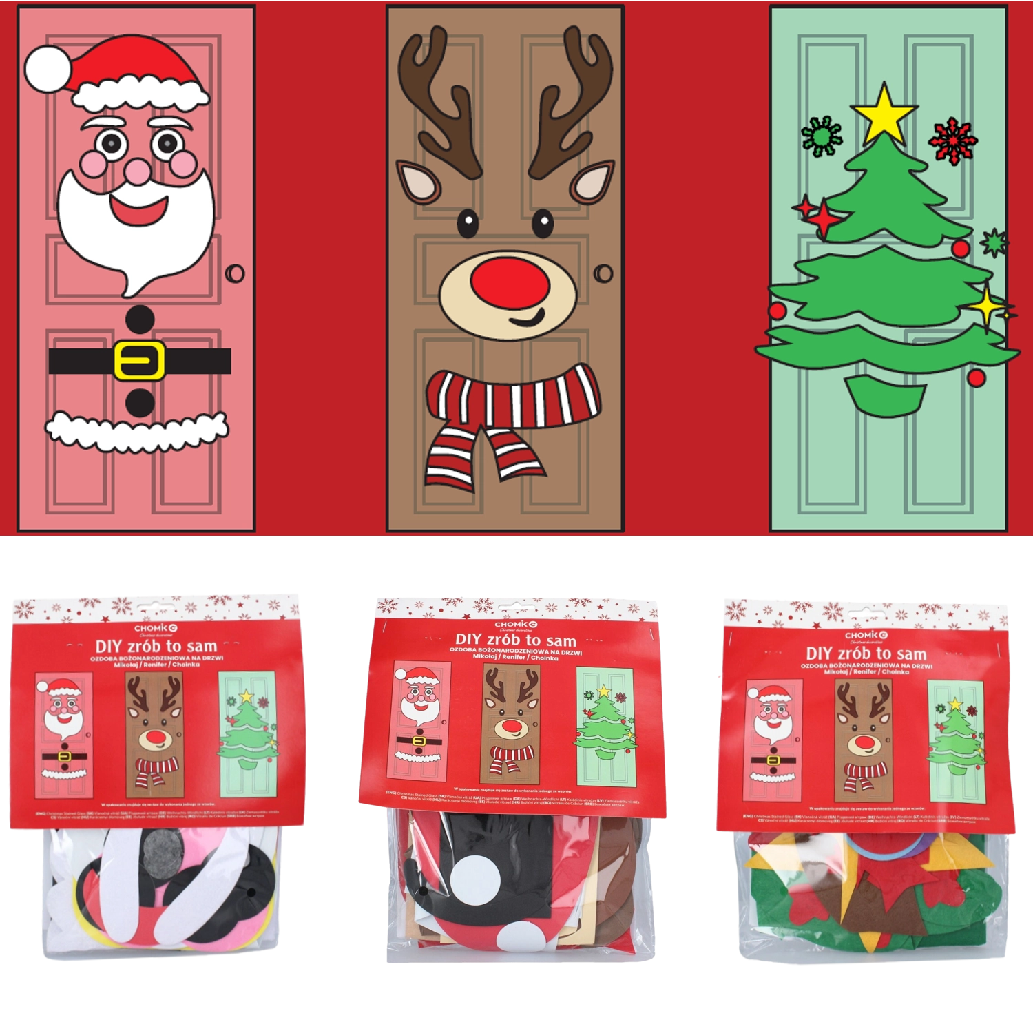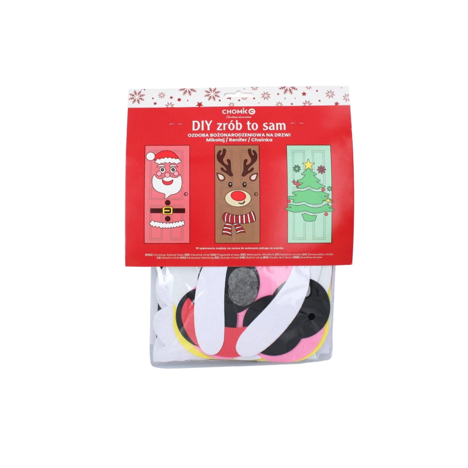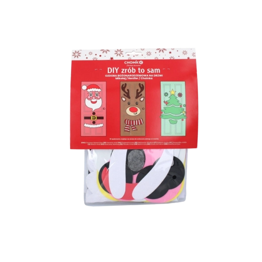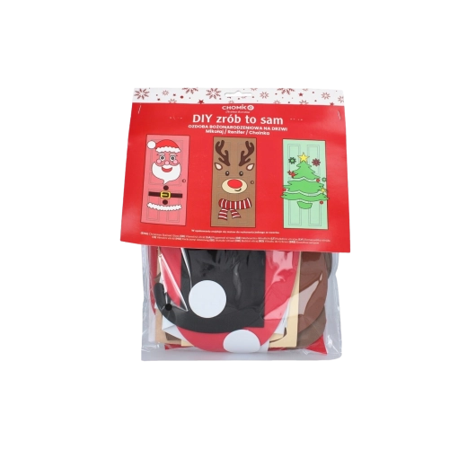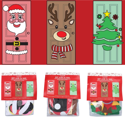 Táto sviatočná dekorácia premení akékoľvek interiérové či vstupné dvere na pôsobivý vianočný prvok. Mäkké plstené a samolepiace časti ľahko pripevníte a kedykoľvek preusporiadate – ideálne pre deti aj dospelých. Vyberte si z motívov vianočného stromčeka, SANTU alebo soba a vytvorte si originálnu výzdobu presne podľa seba.