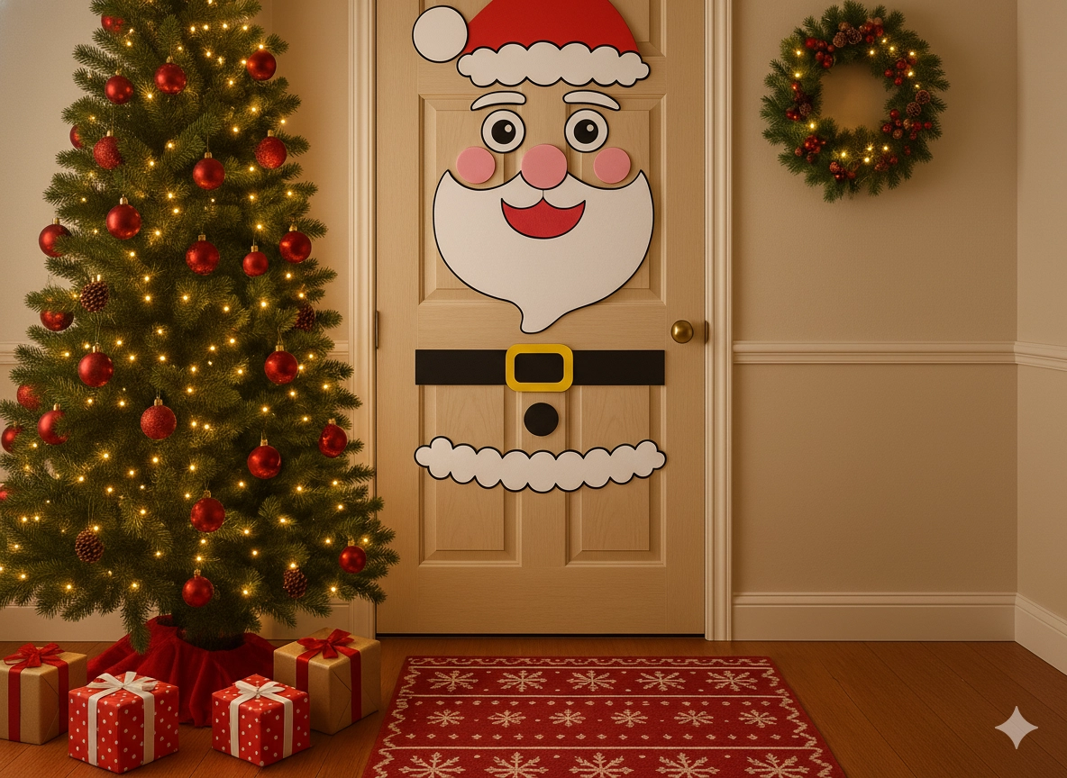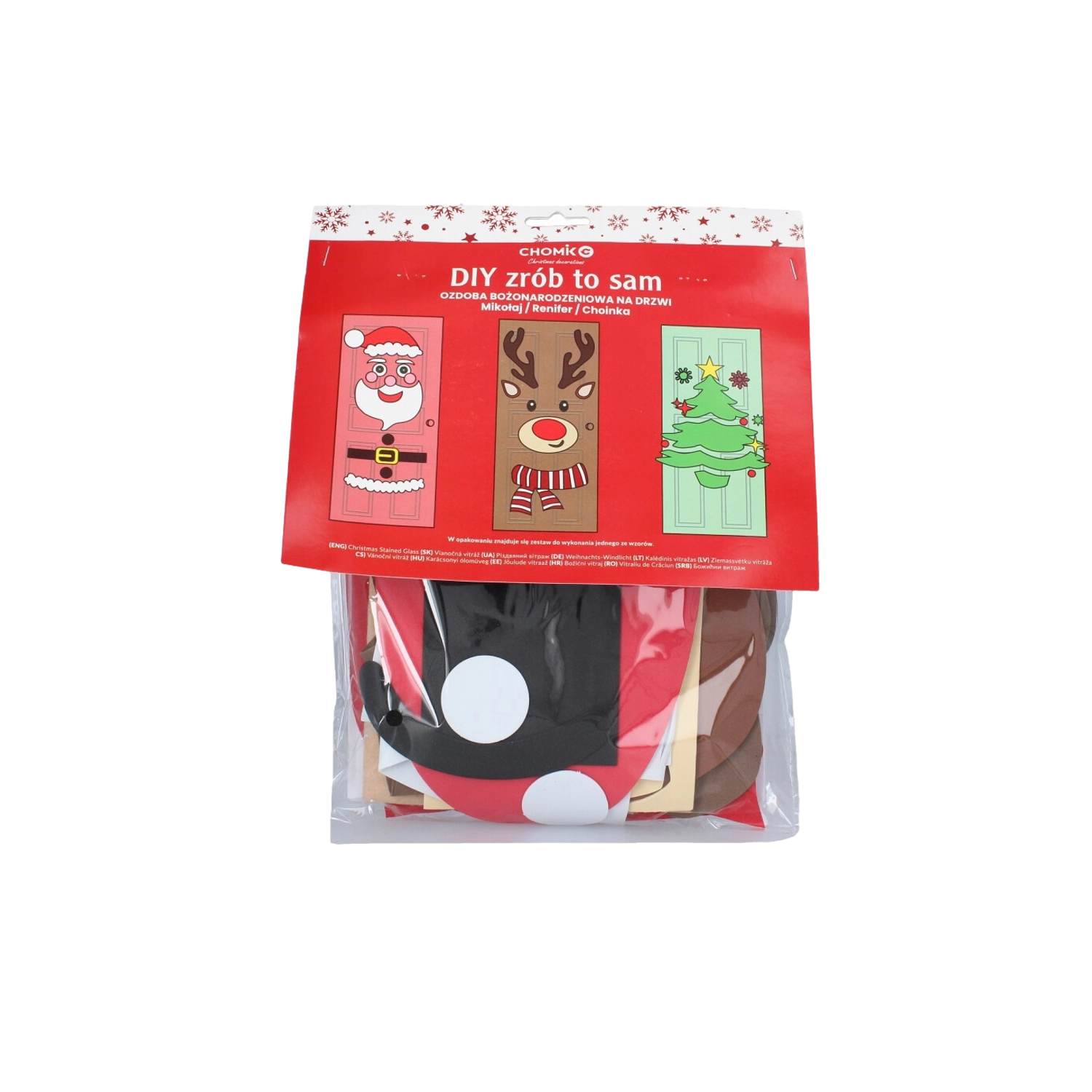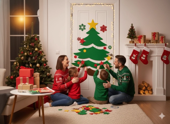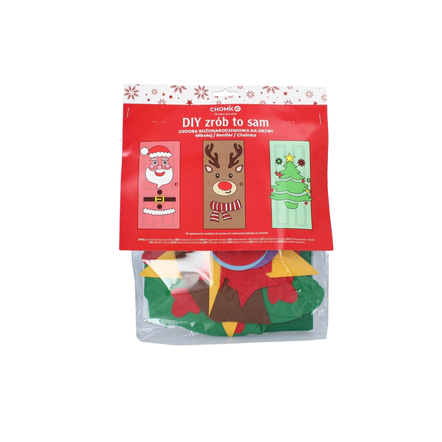 Táto sviatočná dekorácia premení akékoľvek interiérové či vstupné dvere na pôsobivý vianočný prvok. Mäkké plstené a samolepiace časti ľahko pripevníte a kedykoľvek preusporiadate – ideálne pre deti aj dospelých. Vyberte si z motívov vianočného stromčeka, SANTU alebo soba a vytvorte si originálnu výzdobu presne podľa seba.
