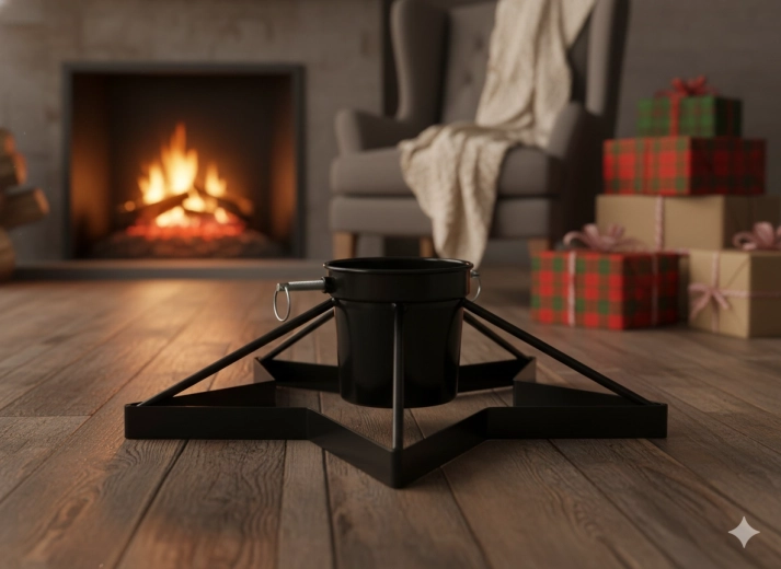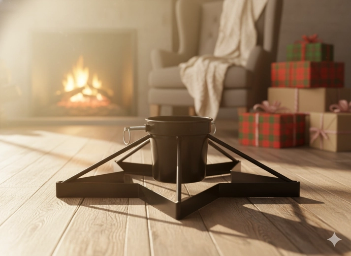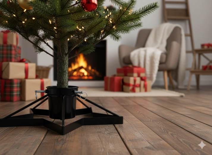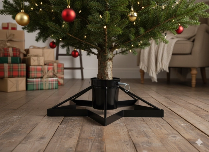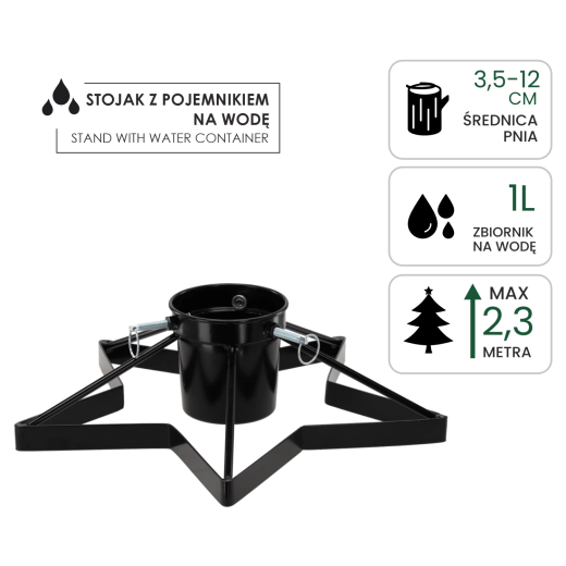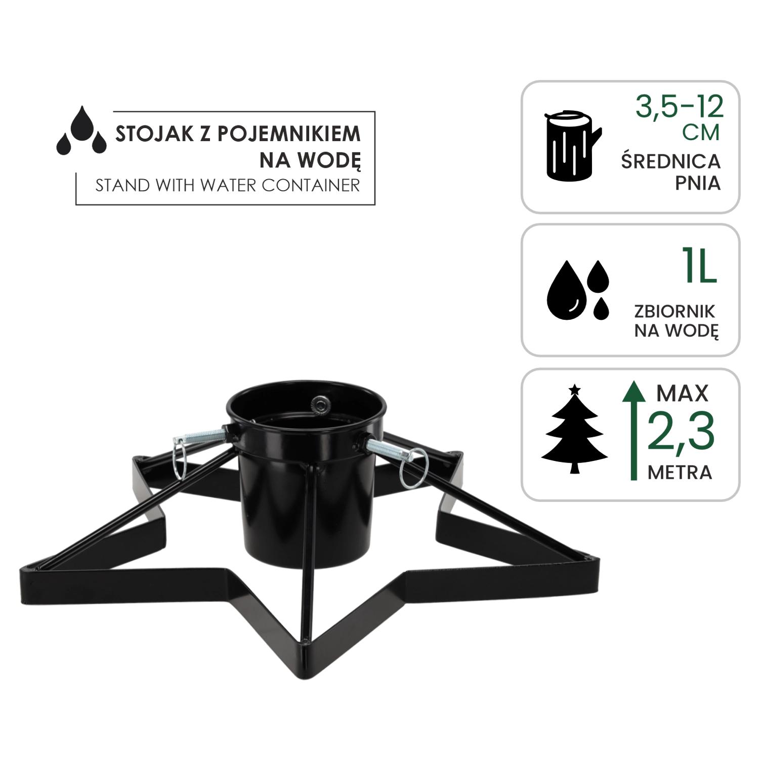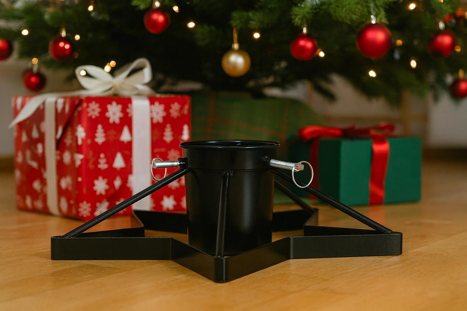 Stromček bezpečne upevníte pomocou regulovateľných skrutiek, ktoré sa prispôsobia priemeru kmeňa približne 35–120 mm. Integrovaný rezervoár na vodu (cca 1 l) uľahčuje údržbu a znižuje opadávanie ihličia. Minimalistické čierne prevedenie pôsobí elegantne a nadčasovo.