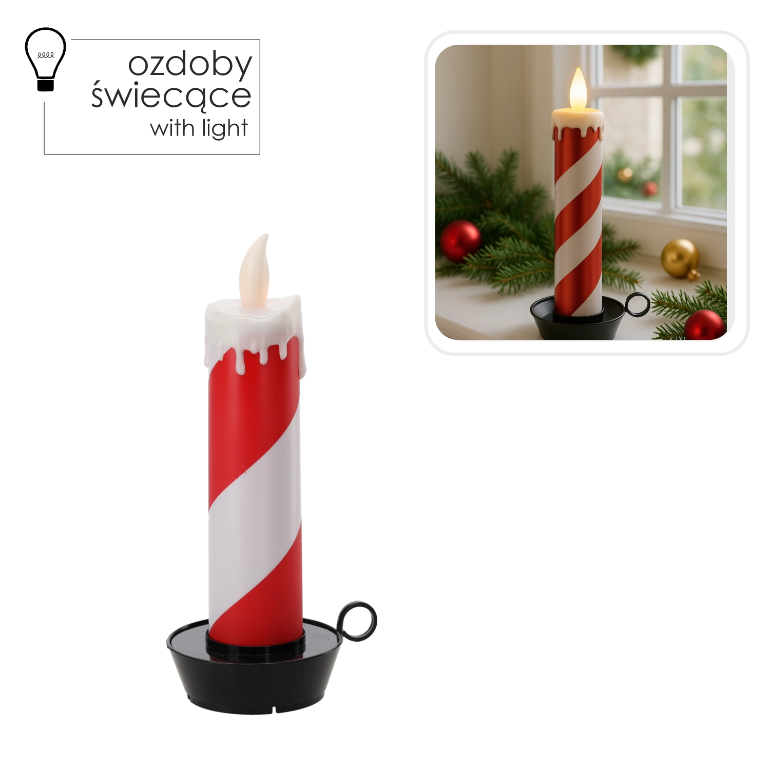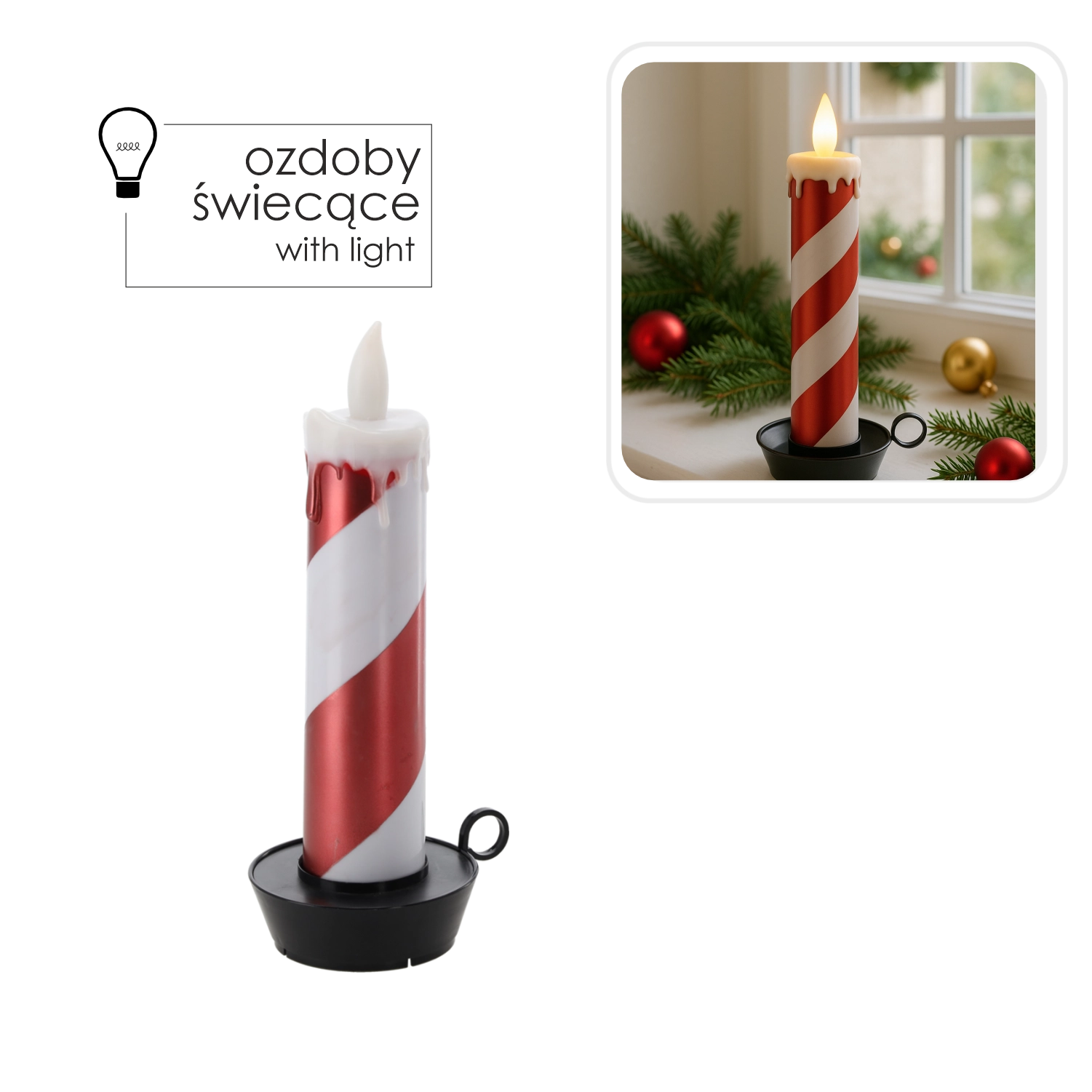 Vytvorte si doma kúzelnú sviatočnú atmosféru s dekoratívnou bielo‑červenou LED sviečkou s výškou 27,5 cm. Ponúka bezpečné, bezplamenné svetlo, realistický efekt plamienka a praktický časovač 6/18 h. Vďaka batériovému napájaniu 2× AA ju ľahko umiestnite na stôl, policu či okenný parapet bez káblov.