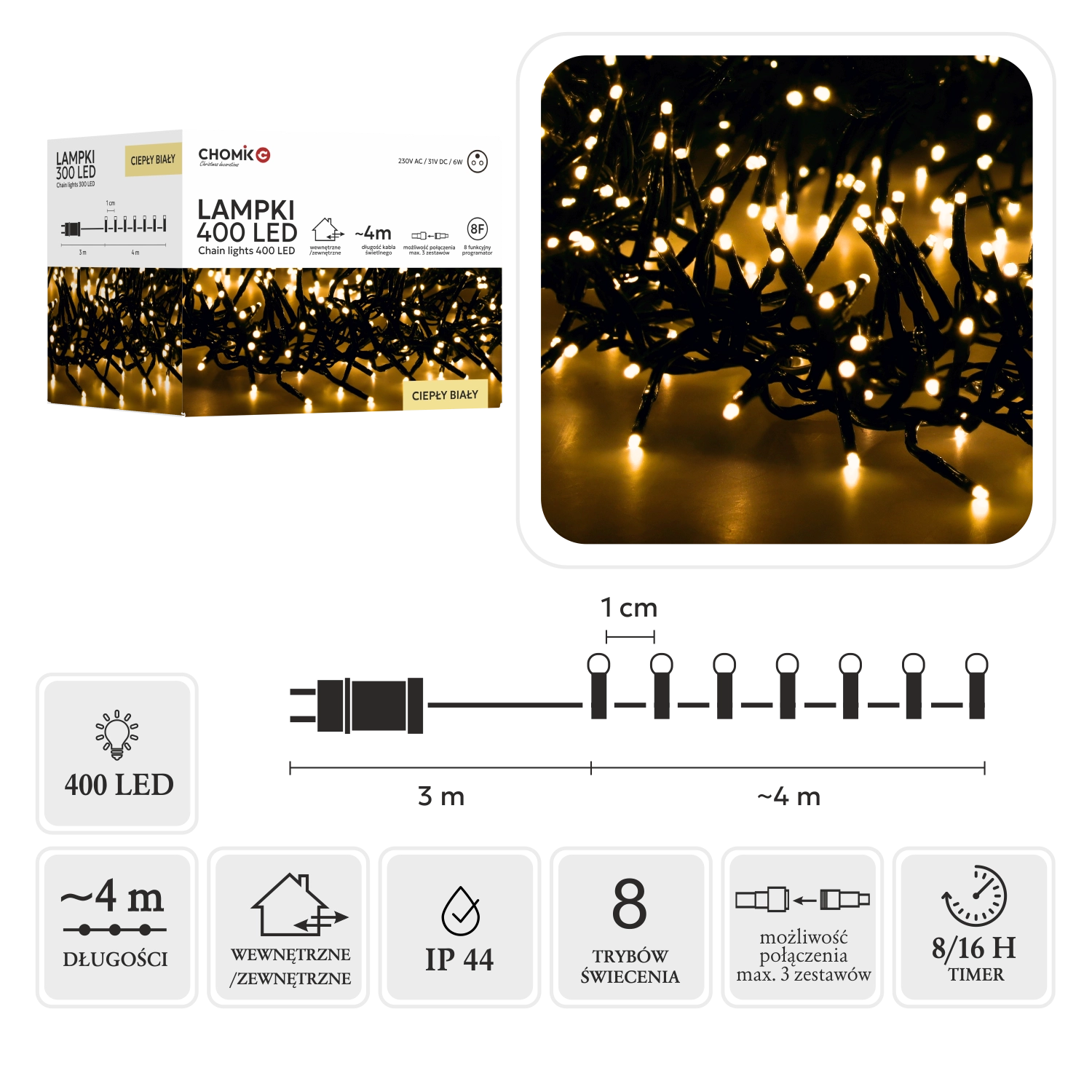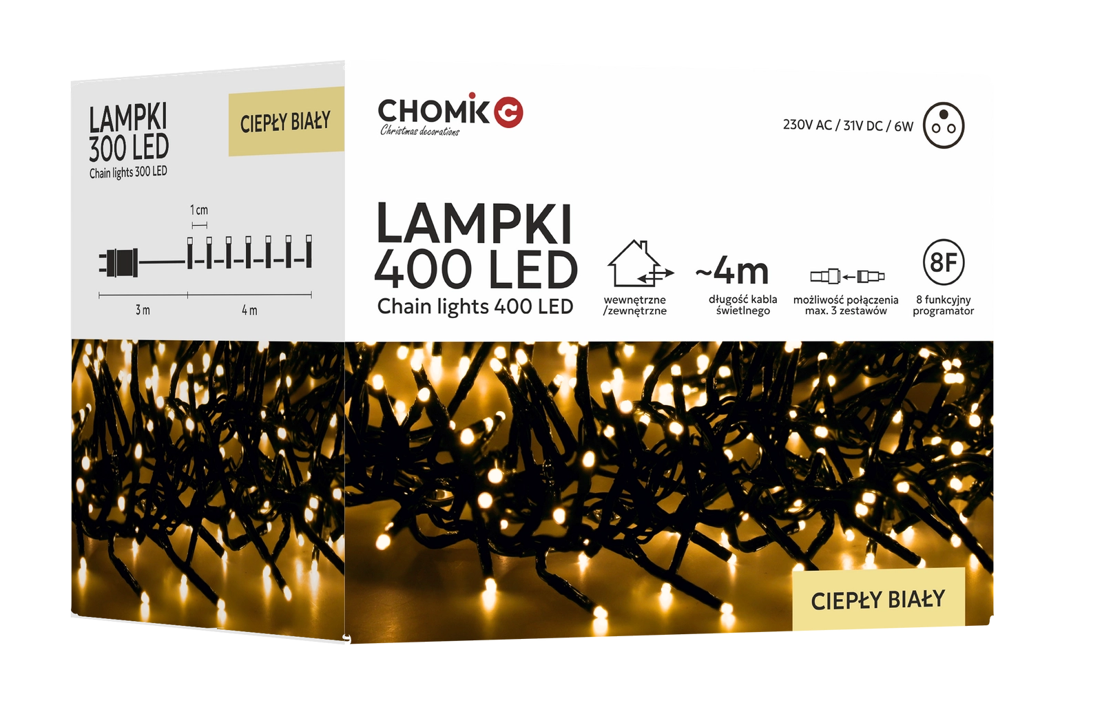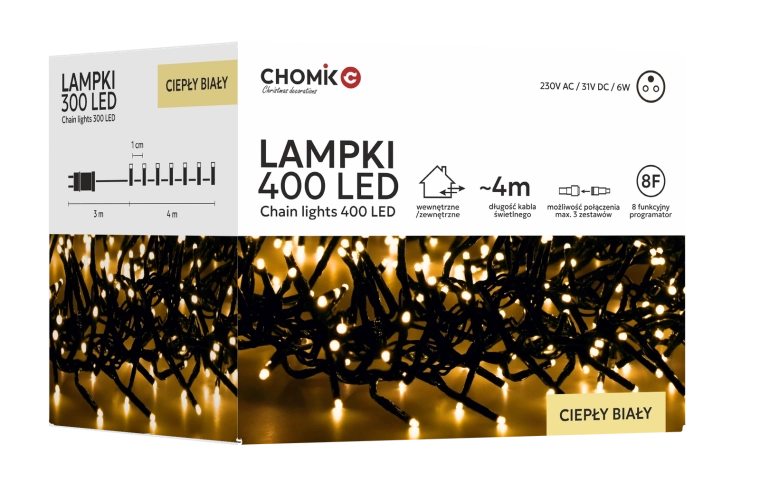 LED reťaz Cluster so 400 diódami prináša efektné, husté svetlo, ktoré vynikne na vianočnom stromčeku, zábradlí, stene aj na záhrade. Teplá biela farba navodí útulnú atmosféru a vďaka ovládaču s pamäťou a časovačom si ľahko nastavíte obľúbený režim bez nutnosti opätovného programovania.