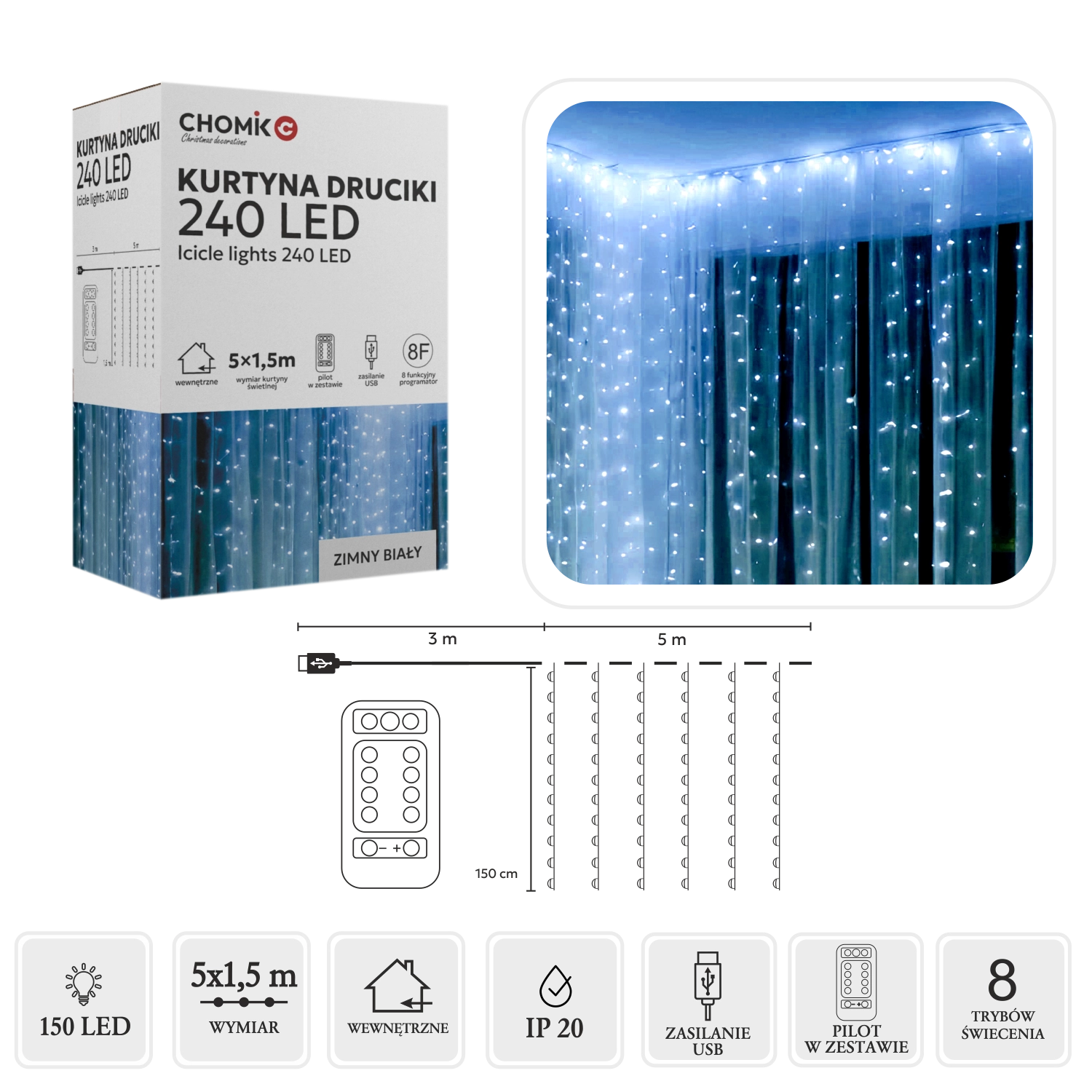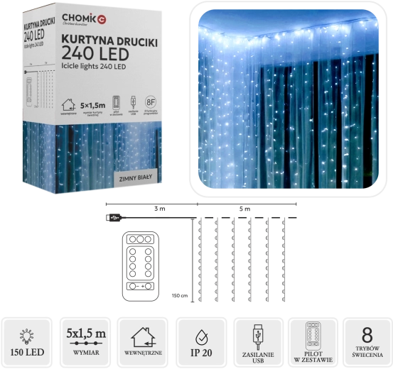 Elegantná svetelná opona s mikro LED v farbe studená biela vyčarí ľadový trbliet na oknách, stenách aj balkónoch. Ponúka 240 LED na ploche 5 × 1,5 m, praktické USB napájanie a diaľkové ovládanie s 8 svetelnými programami. Vďaka krytiu IP44 je vhodná pre interiér aj exteriér, strieborný vodič dodá dekorácii jemnosť a eleganciu.