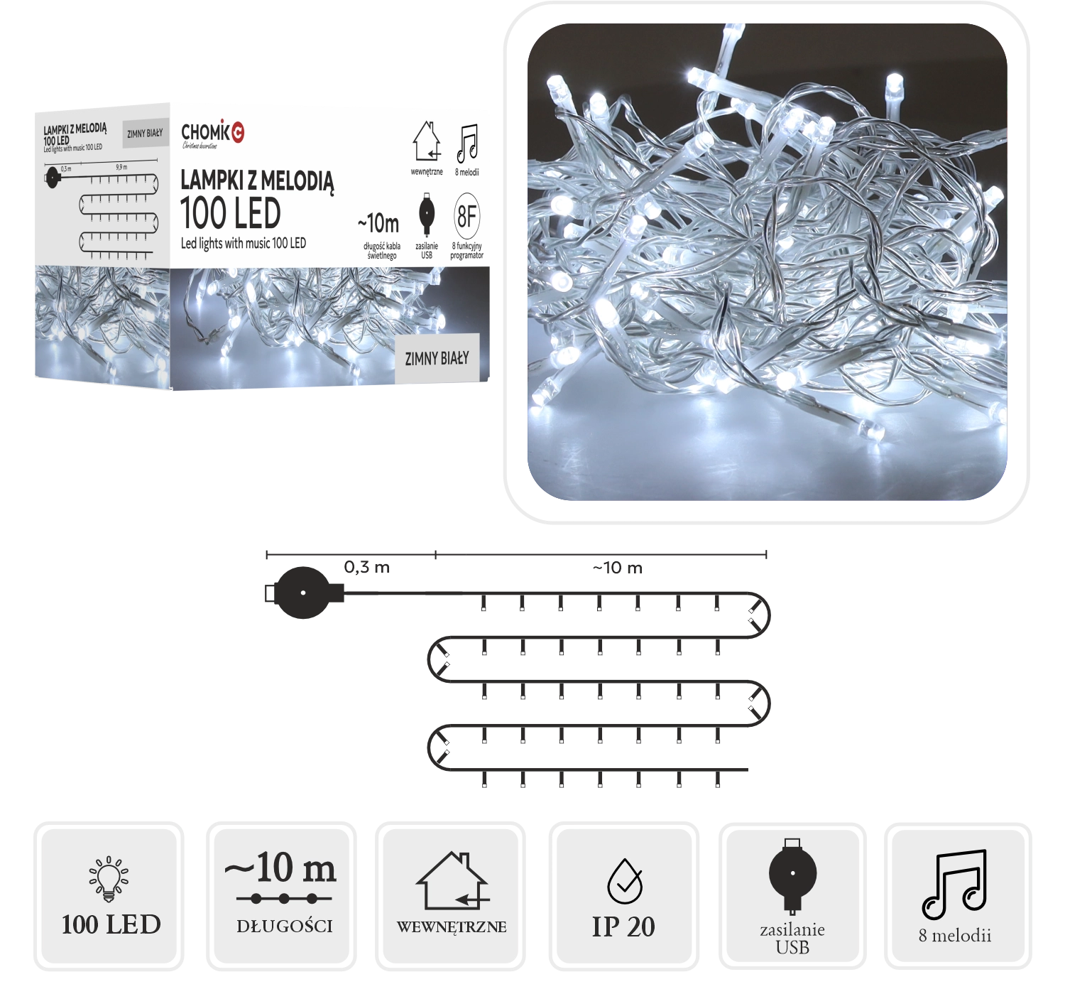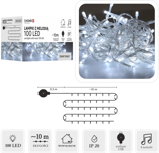 Elegantný LED svetelný reťaz v studenej bielej so 100 LED a melódiami pre sviatočnú atmosféru. Dĺžka 10 m, napájanie USB, priehľadný kábel a IP44 na použitie vnútri aj vonku – na stromček, okná, terasu aj balkón.