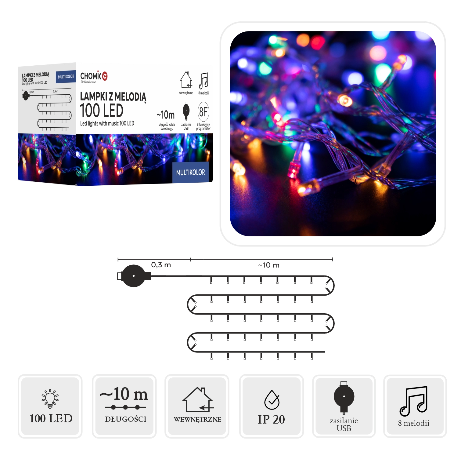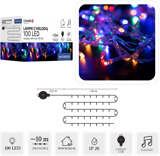 Praktické USB napájanie s melódiami umožňuje flexibilné použitie – pripojte ju k powerbanke, notebooku alebo sieťovému adaptéru. Vďaka krytiu IP44 sa reťaz hodí na vnútorné aj chránené vonkajšie dekorácie: stromčeky, zábradlia, okná či terasy.