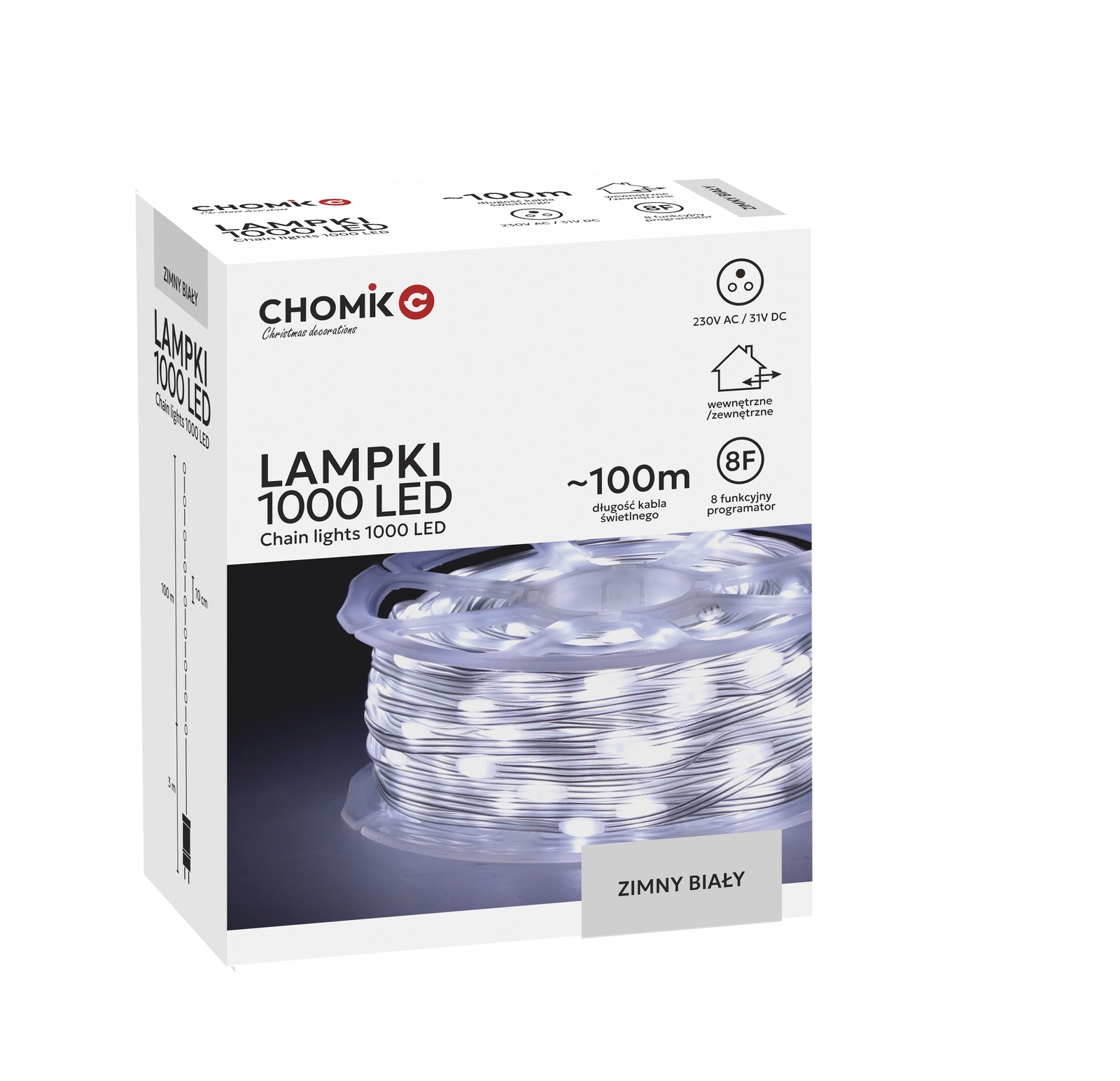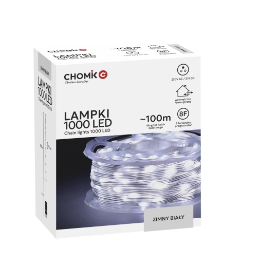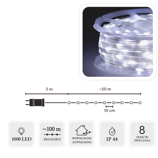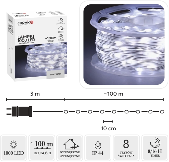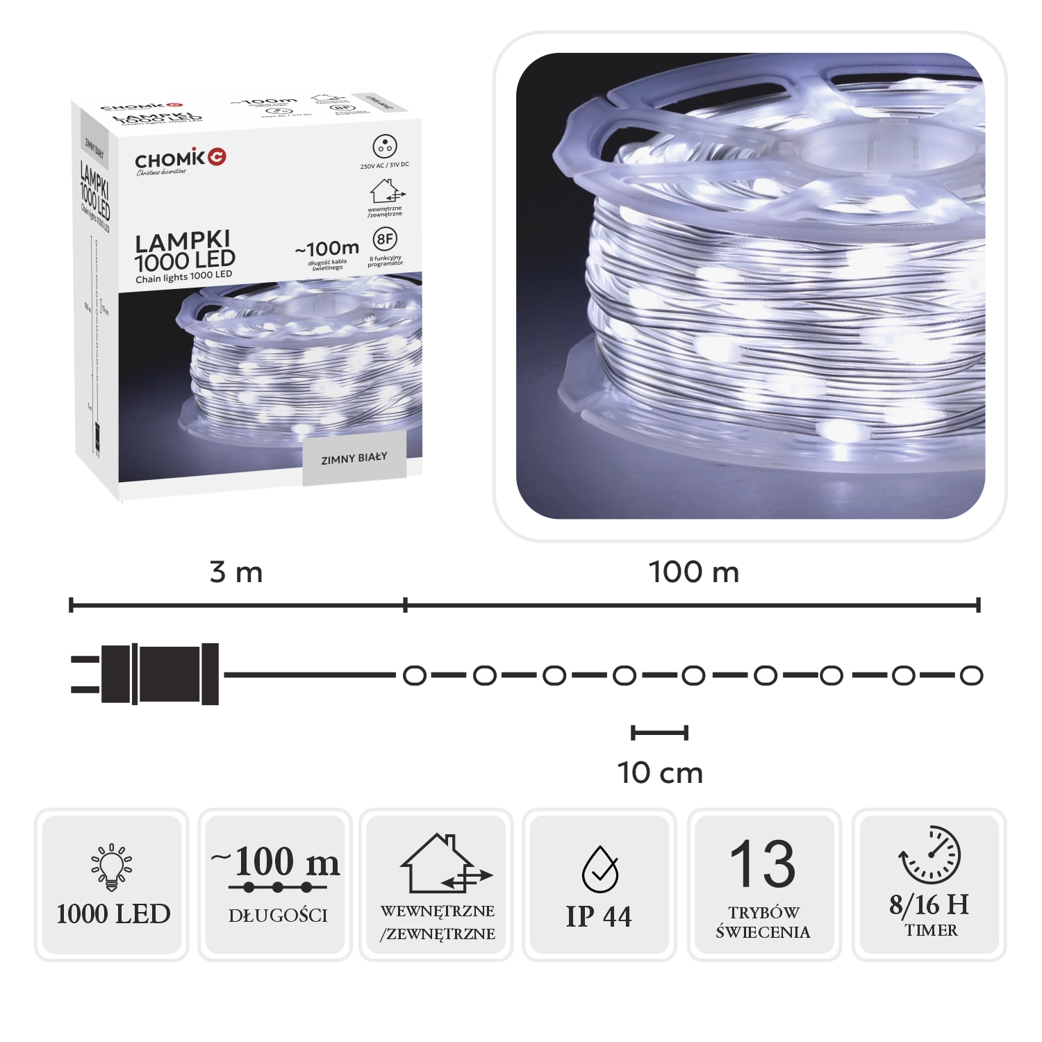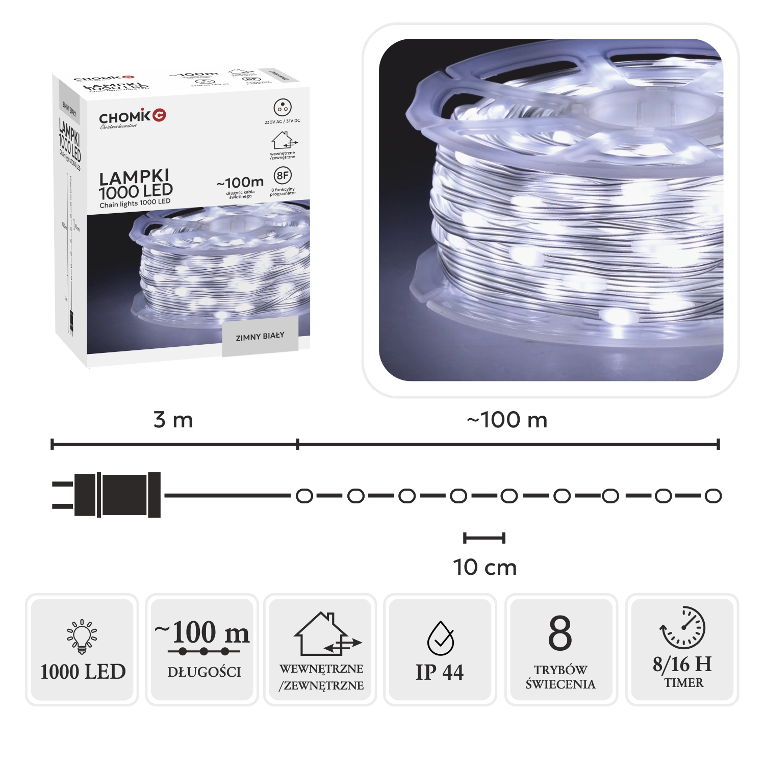 Profesionálny svetelný reťaz s 1000 mikro LED v studenej bielej farbe pre veľké dekorácie a exteriéry. 100 m svietiacej časti a transparentný kábel vytvárajú elegantný efekt hviezd. Pohodlné ovládanie zabezpečuje programátor s 8 režimami, pamäťou a časovačom 8/16 h. Krytie IP44 pre bezpečné vonkajšie použitie.