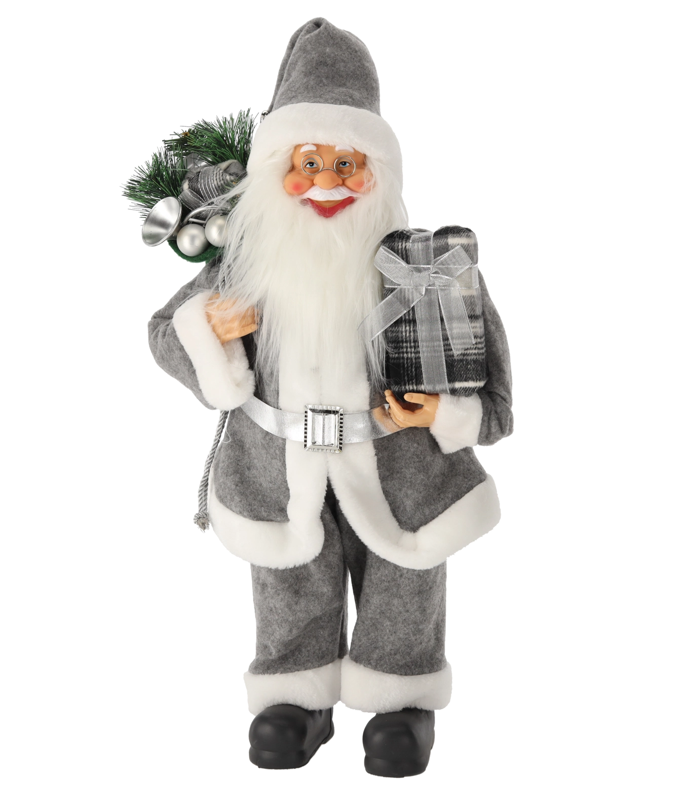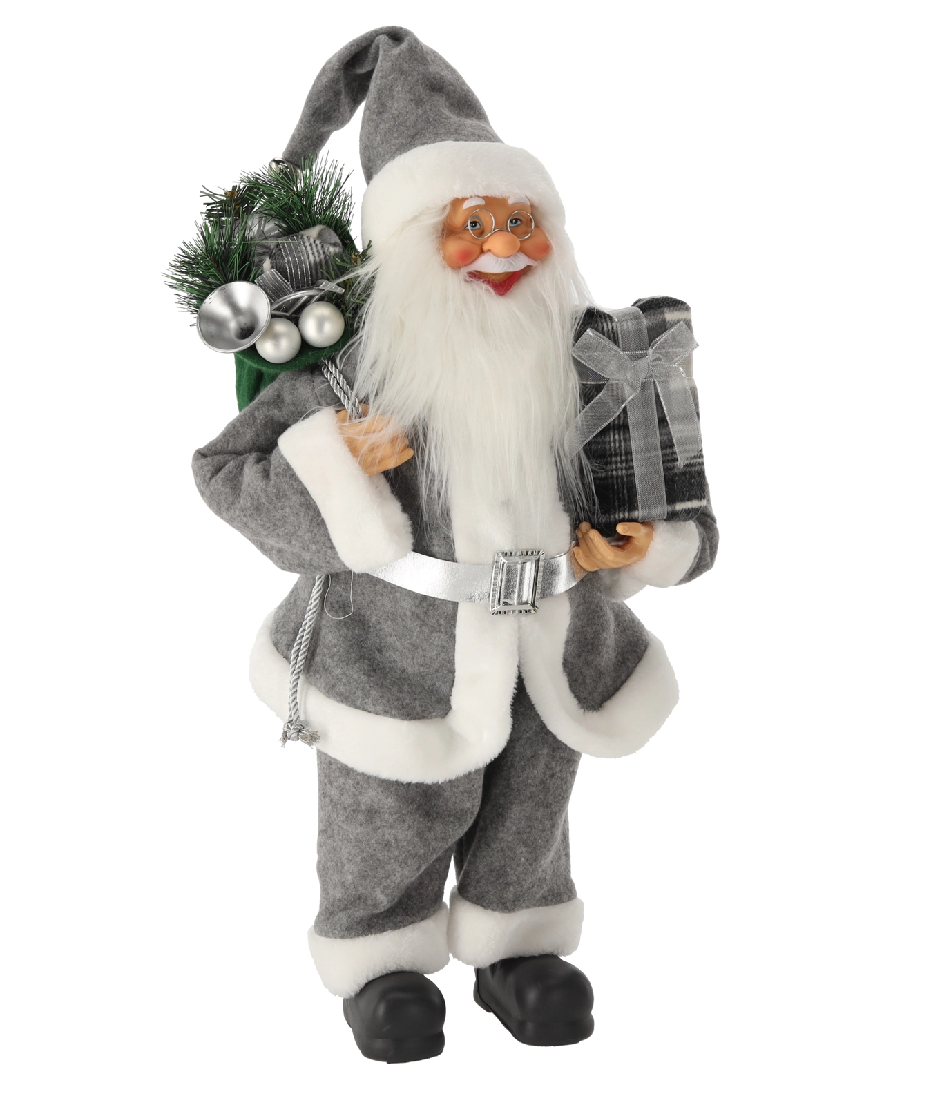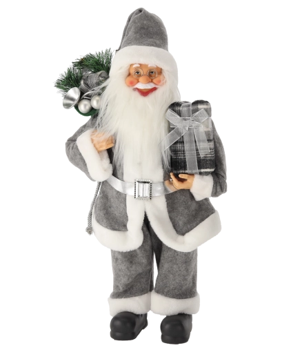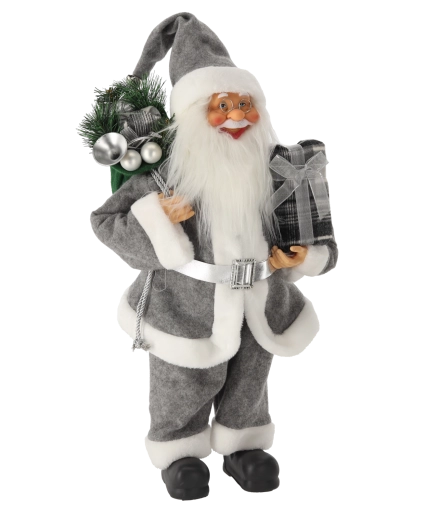 Táto dekoratívna figúrka SANTU v sivom prevedení sa perfektne hodí do obývačky, haly, kancelárie či hotelového lobby. Vďaka kvalitným materiálom a pevného spracovania pôsobí realisticky a zostane krásna aj po niekoľkých sezónach. Sivý odev s kožušinovým lemom, striebornými detailmi a čiernymi topánkami ľahko zladíte s moderným, škandinávskym aj glamour štýlom.