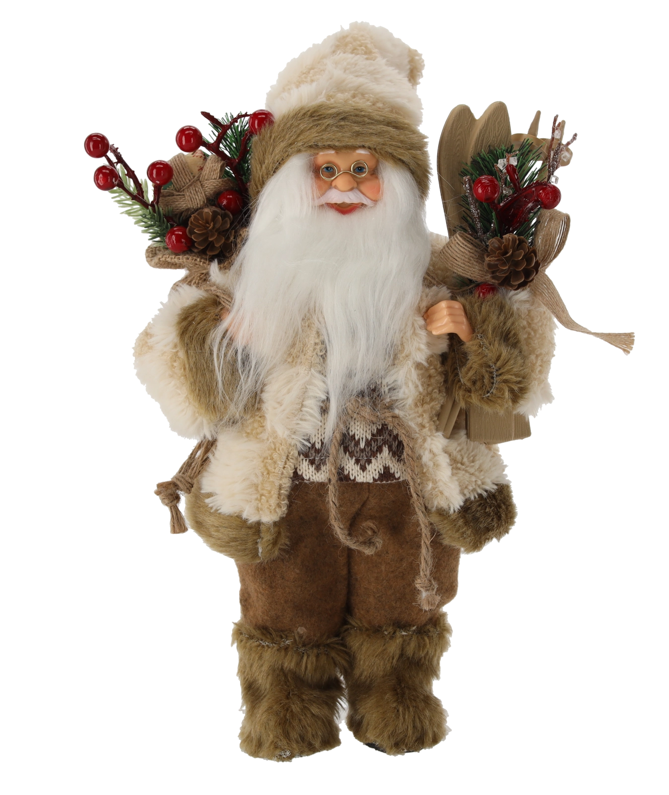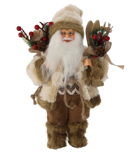 Táto štýlová figúrka znázorňuje stojaceho Santa Clausa v jemnom béžovom plášti s drevenými lyžami, ktorý evokuje zimné radovánky a tradičné vianočné motívy. Vďaka svojej výške 30 cm sa stane výraznou, no nerušivou dekoráciou pre každý domov – od klasického po moderný.