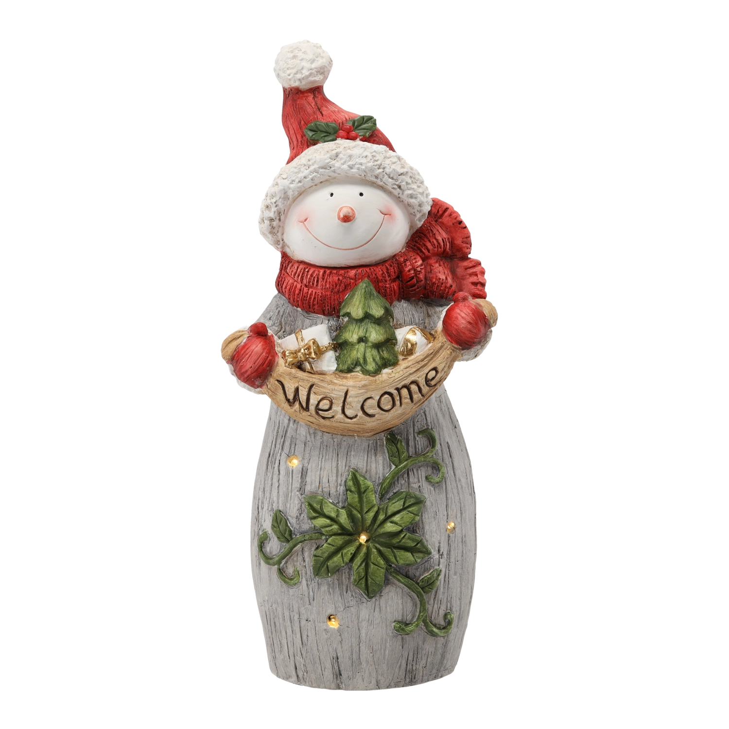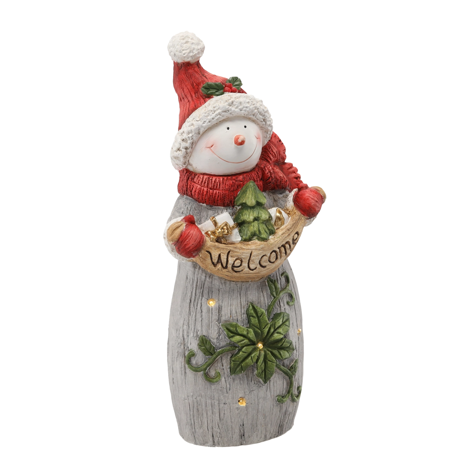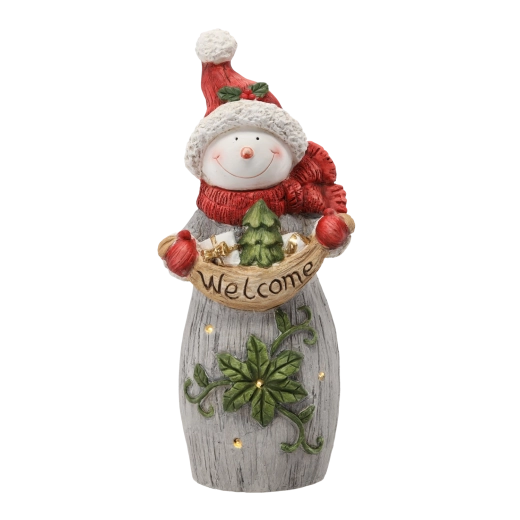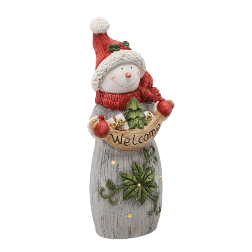Tento veselý snehuliak v červenej čiapke a šále sa stane stredobodom vašej sviatočnej výzdoby. Drží tabuľku s nápisom WELCOME a vďaka jemným LED svetielkam pridá vášmu domovu príjemné teplé kúzlo Vianoc. Realistické detaily, reliéfna štruktúra a maľované akcenty podčiarkujú kvalitné prevedenie.