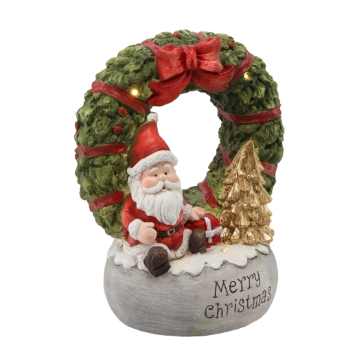 Táto elegantná vianočná figúrka prináša do interiéru hrejivú atmosféru. Dekoratívny veniec so SANTOM a nápisom „Merry Christmas“ je doplnený jemným LED svetlom, ktoré zvýrazní detaily a vytvorí útulné svetlo na poličke, komode či parapete. Kvalitný materiál z magnezity zaručuje odolnosť a dlhú životnosť.