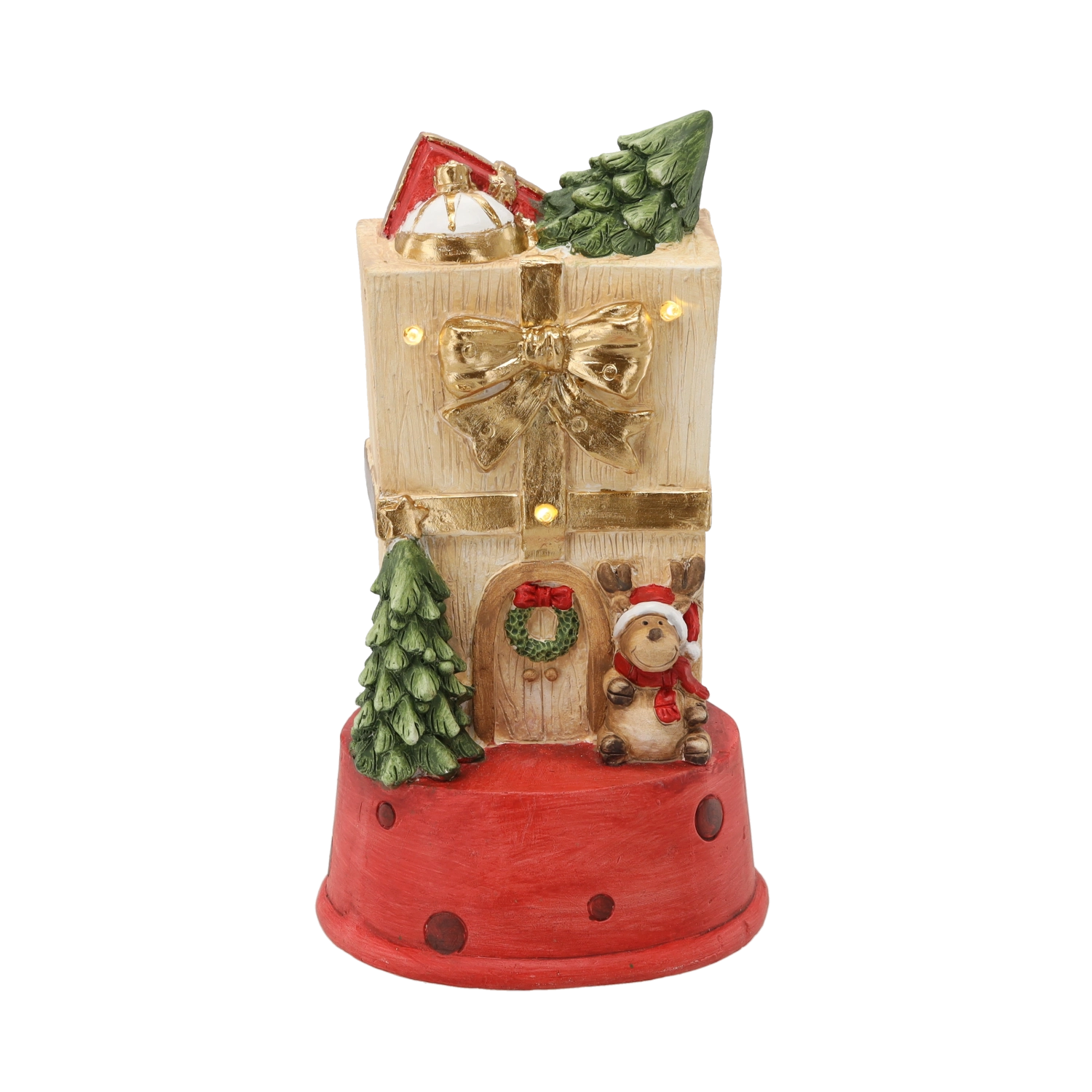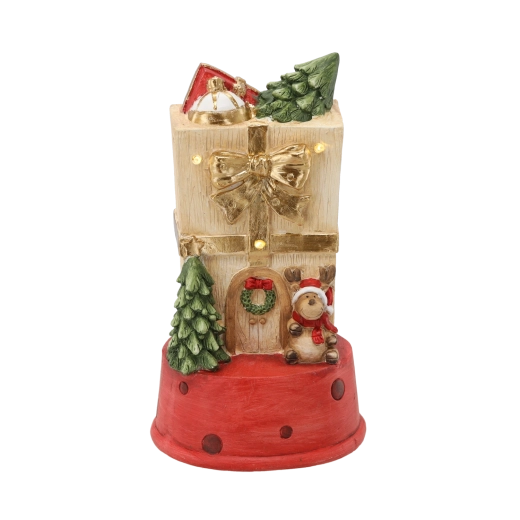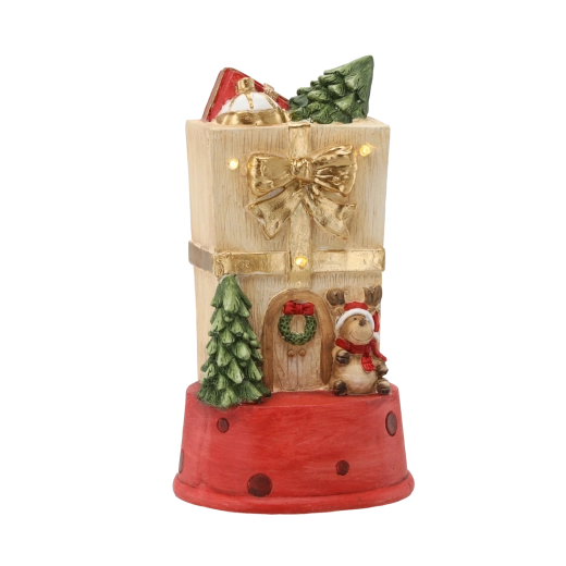 Táto detailne spracovaná vianočná dekorácia v tvare darčekového domčeka s jeleňom vnesie do interiéru teplo a pohodu. Integrované LED svetielka dodajú jemný svit, ktorý krásne podčiarkne sviatočnú výzdobu bez oslnenia.