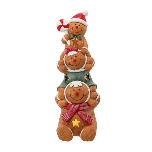 Vytvorte si doma čarovnú vianočnú scenériu s figúrkou troch perníkových postavičiek, ktoré jemne presvetľuje integrované LED osvetlenie. Dekorácia vyniká kvalitným spracovaním z odolnej magnéziovej zmesi a univerzálnymi rozmermi 16 × 16 × 43 cm, ktoré sa hodia na väčšinu políc, krbových ríms aj vstupných hál.