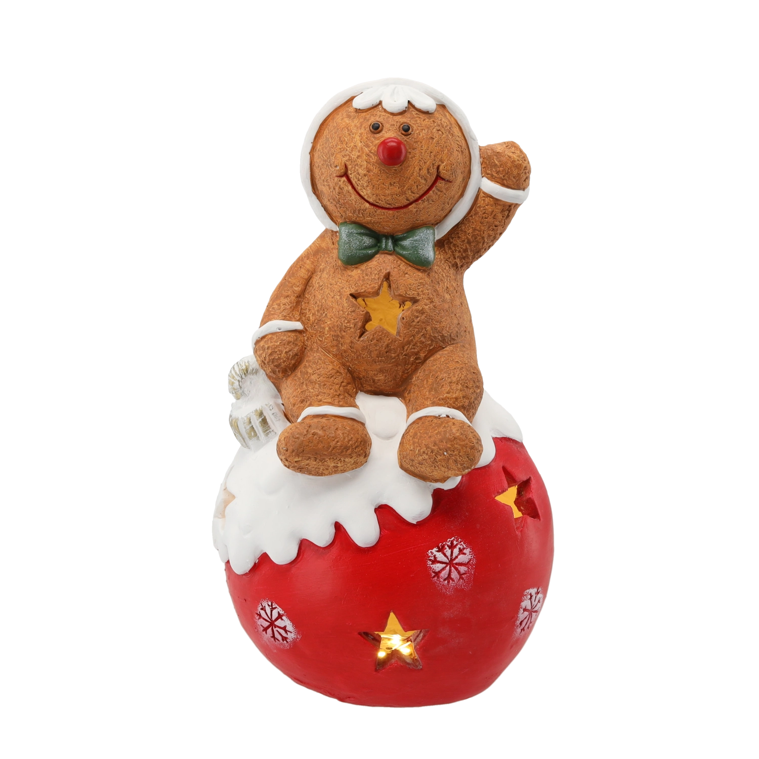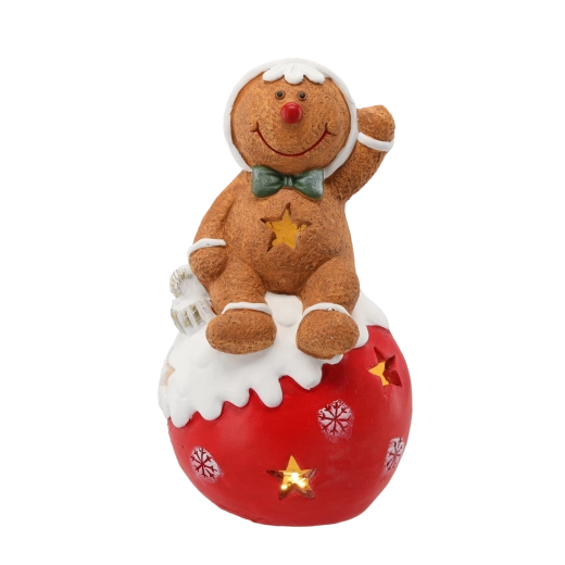 Roztomilá vianočná dekorácia v podobe perníkového mužíčka sediaceho na ozdobnej baňke dodá vášmu domovu čarovnú atmosféru. Integrované LED osvetlenie vytvára hrejivý efekt, odolný materiál z magnezitovej keramiky zaručuje stabilitu a dlhú životnosť. Ideálne ako sviatočná výzdoba na poličku, komodu či parapet.