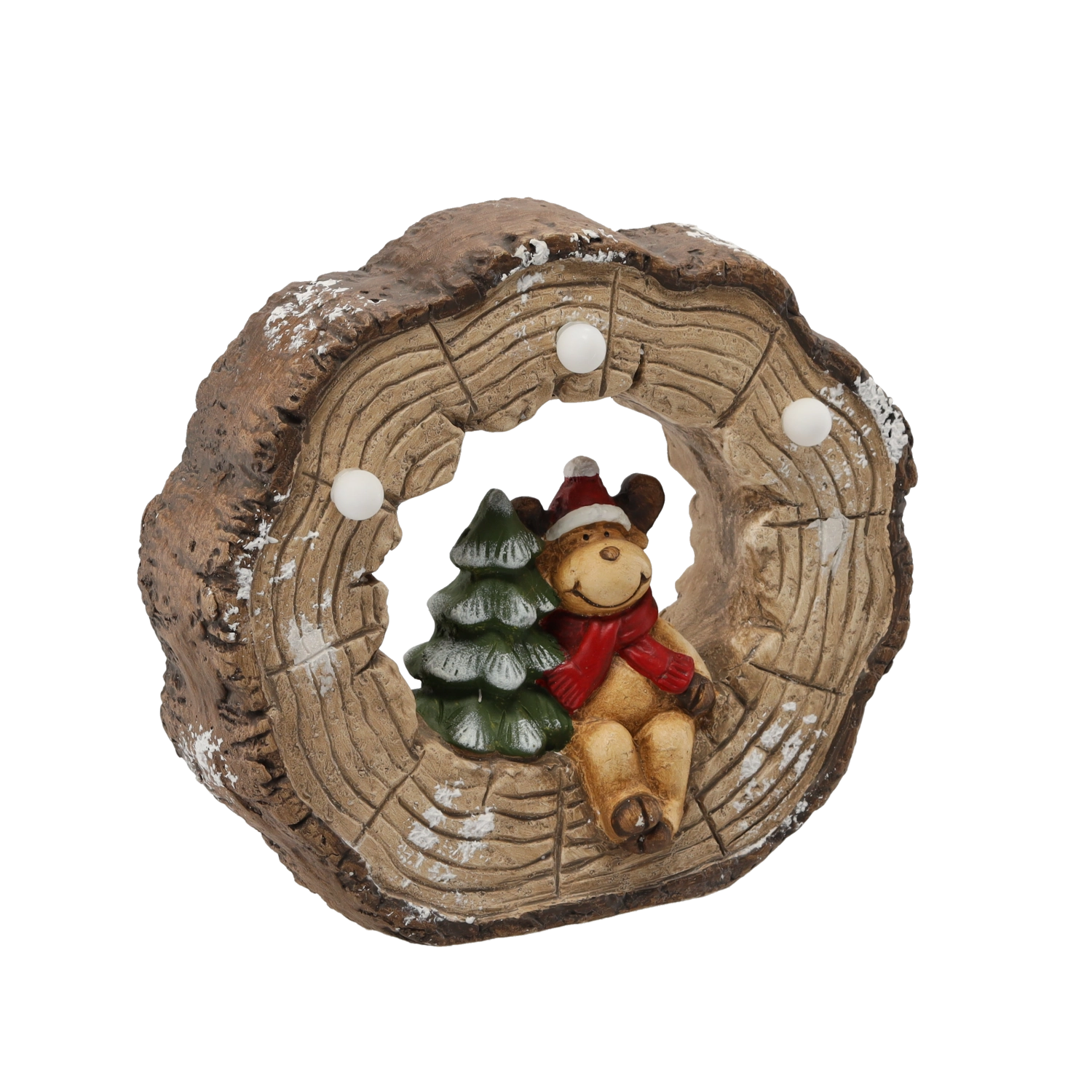 Táto vianočná figúrka s jeleňom ukrytým v dutine pňa prináša teplé svetelné akcenty do každého interiéru. Integrované LED svetlo jemne presvitá detailmi dekorácie a vytvára príjemné sviatočné čaro bez prehrievania a s nízkou spotrebou energie.