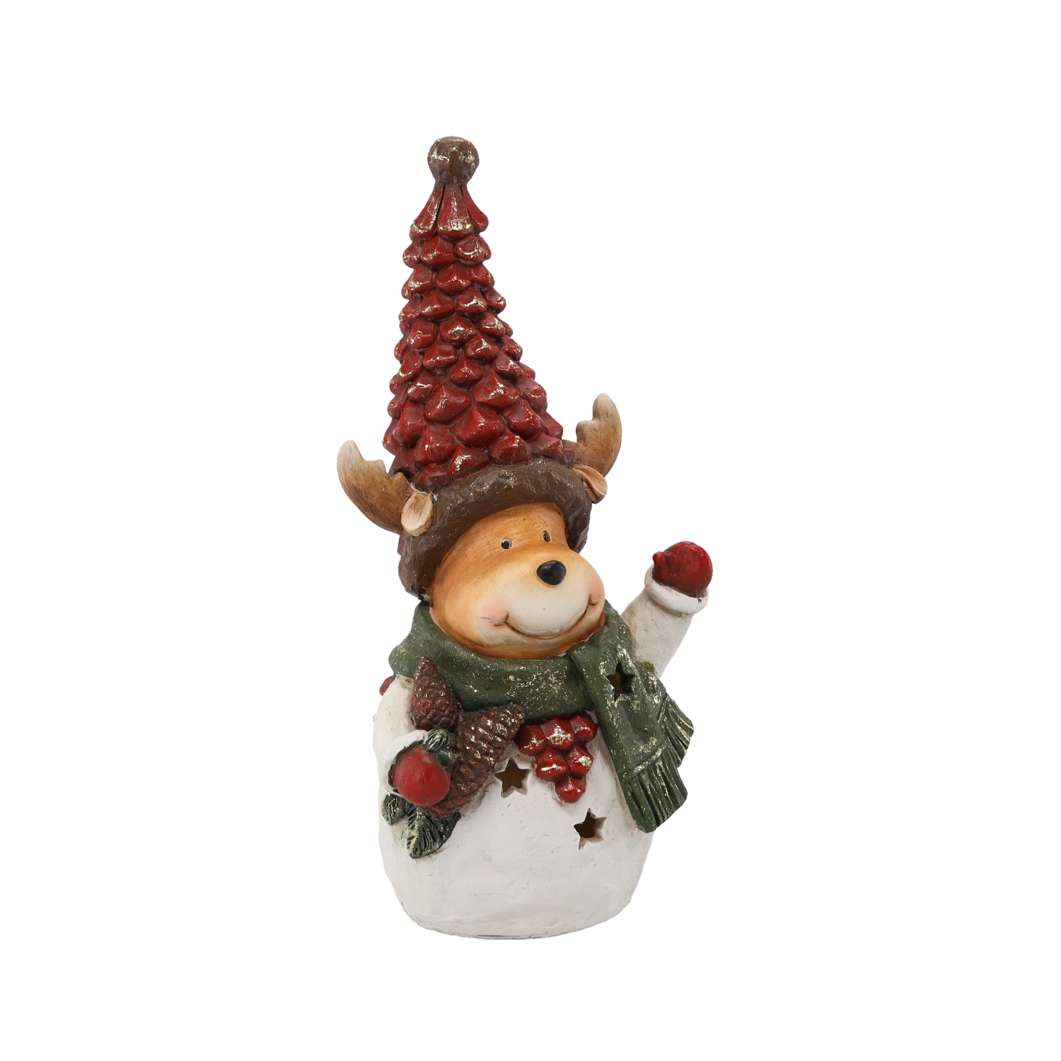 Elegantná vianočná dekorácia z odolnej polyresínu prináša do interiéru teplo a slávnostnú atmosféru. Figúrka medvedíka alebo soba v pletenej čiapke a so šálom je detailne maľovaná a vďaka LED svetlu jemne presvetľuje hviezdičkové výrezy na tele.