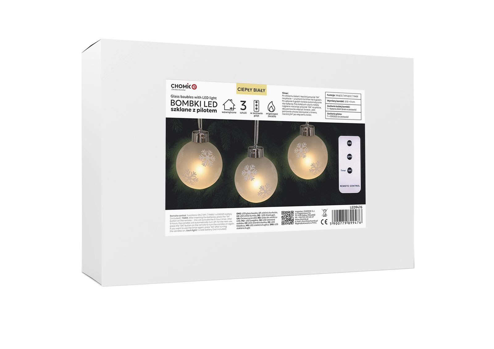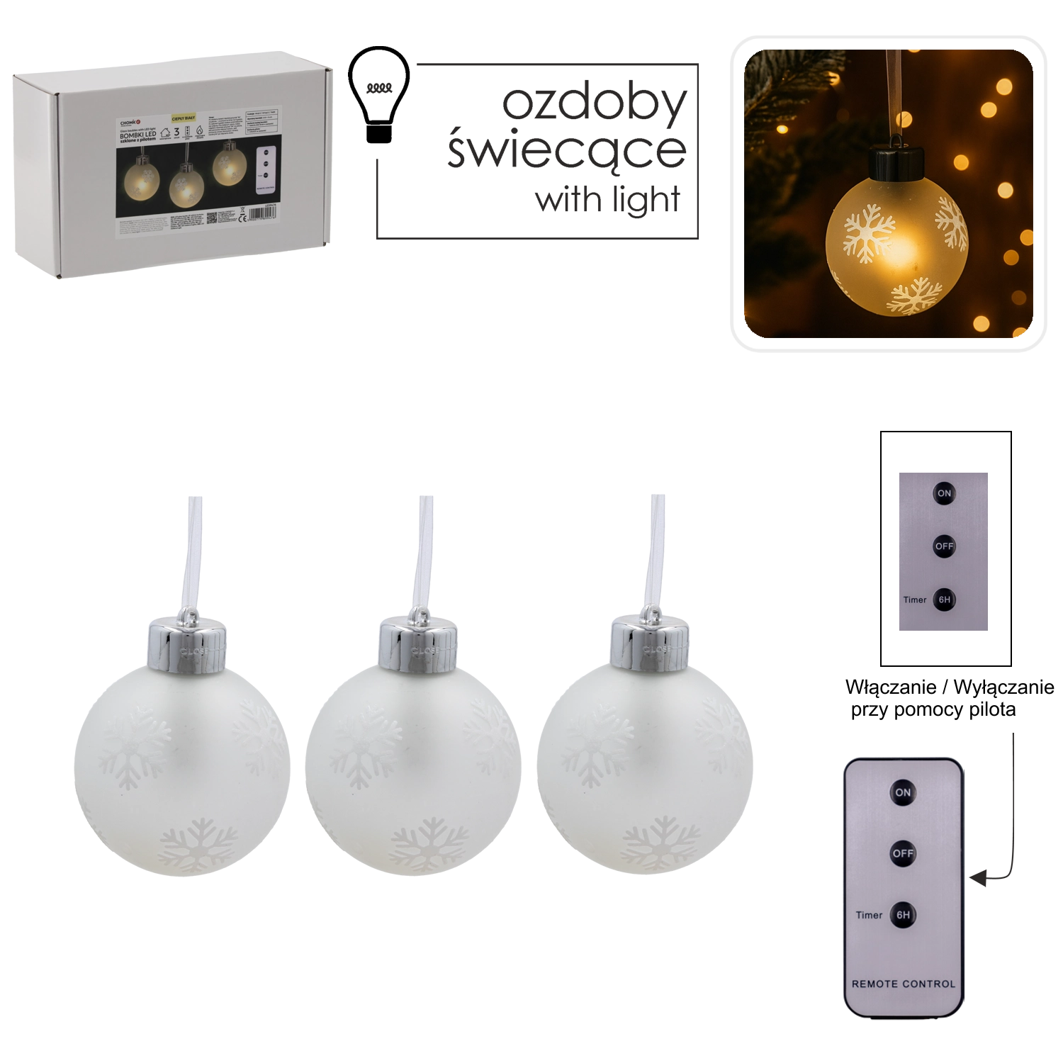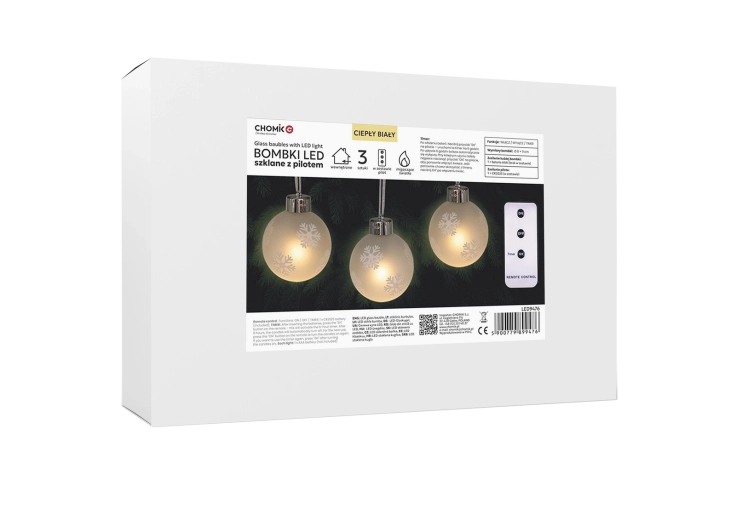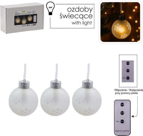 Vytvorte si doma kúzelnú sviatočnú atmosféru so sadou troch sklenených vianočných gúľ s jemným vzorom snehových vločiek a teplým LED svetlom. Vďaka diaľkovému ovládaniu s časovačom a napájaniu na batérie je dekorácia jednoducho ovládateľná, bezpečná a okamžite pripravená na použitie kdekoľvek na stromčeku, polici či stole.