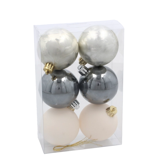 Každá guľa je vybavená ozdobným šnúrkou pre jednoduché zavesenie na stromček, veniec či girlandu. Rôznorodé povrchové úpravy – lesk, mat a trbliet dodajú aranžmánu hĺbku, kontrast a sviatočnú iskru. Praktické balenie v tube uľahčuje skladovanie aj ochranu ozdôb po Vianociach.