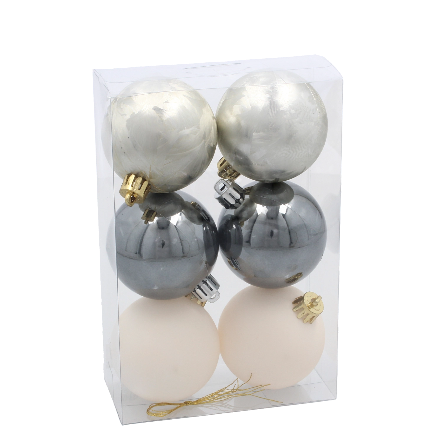 Táto dizajnová súprava vianočných gulí v decentných tónoch šampanskej, sivej a bielej prináša vyváženú estetiku, ktorá sa hodí k tradičným aj moderným dekoráciám. Vďaka netrieskavému plastu si užijete krásu skla bez obáv z rozbitia a s dlhou životnosťou na mnoho sezón.