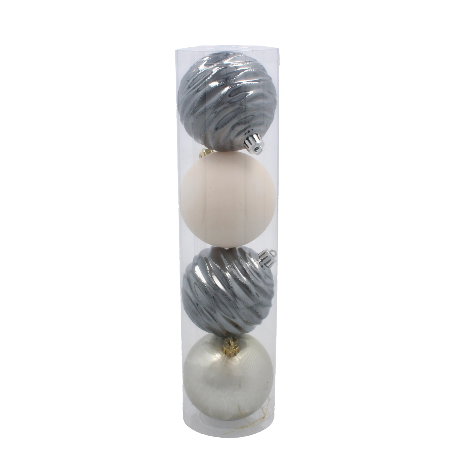 Elegantná súprava štyroch vianočných gúľ s priemerom 8 cm v odtieňoch šampanského, sivej a bielej dodá výzdobe sofistikovaný vzhľad a harmóniu. Odolný plast zabezpečuje bezpečnú manipuláciu a dlhú životnosť, mix matných, lesklých a trblietavých povrchov vytvára efektný kontrast. Praktická priehľadná tuba slúži na uloženie, vystavenie aj jednoduché darovanie.