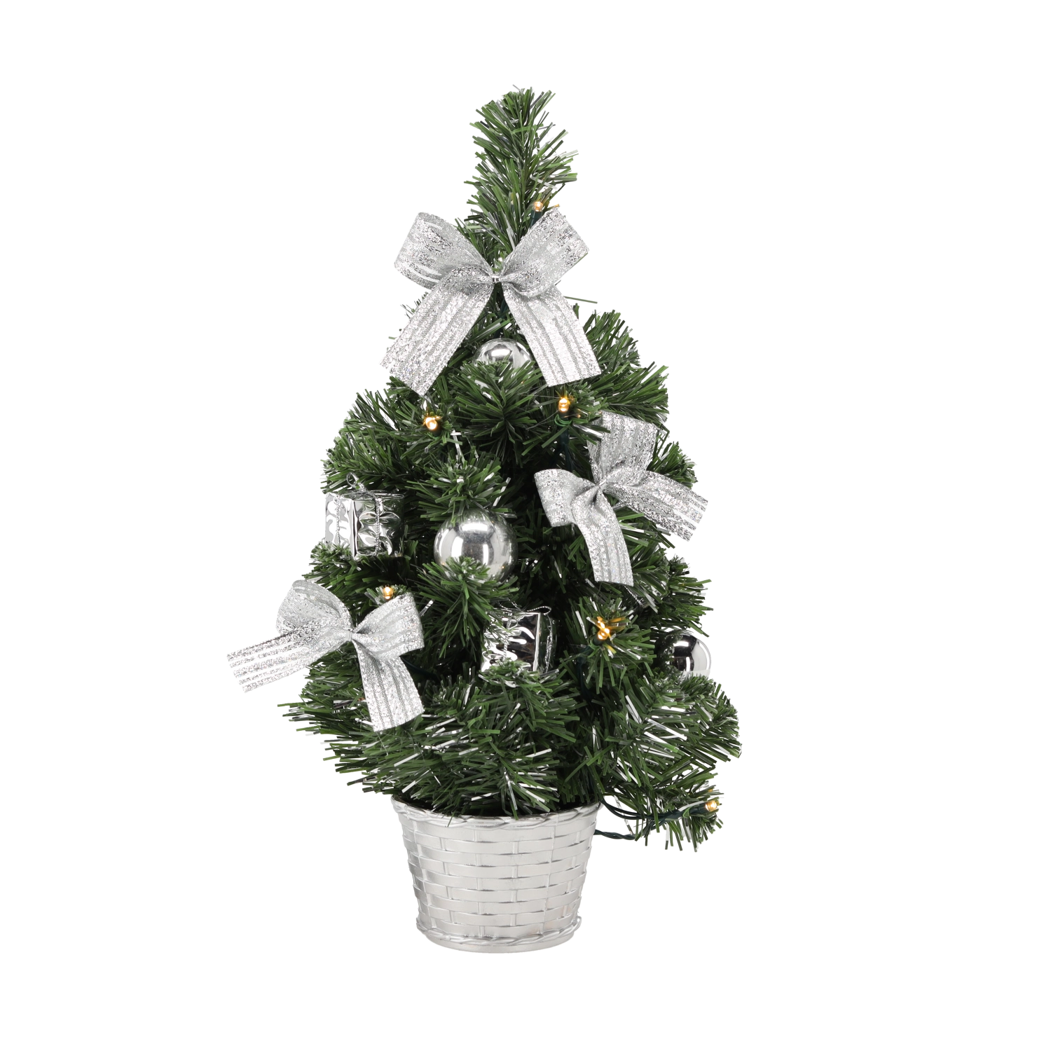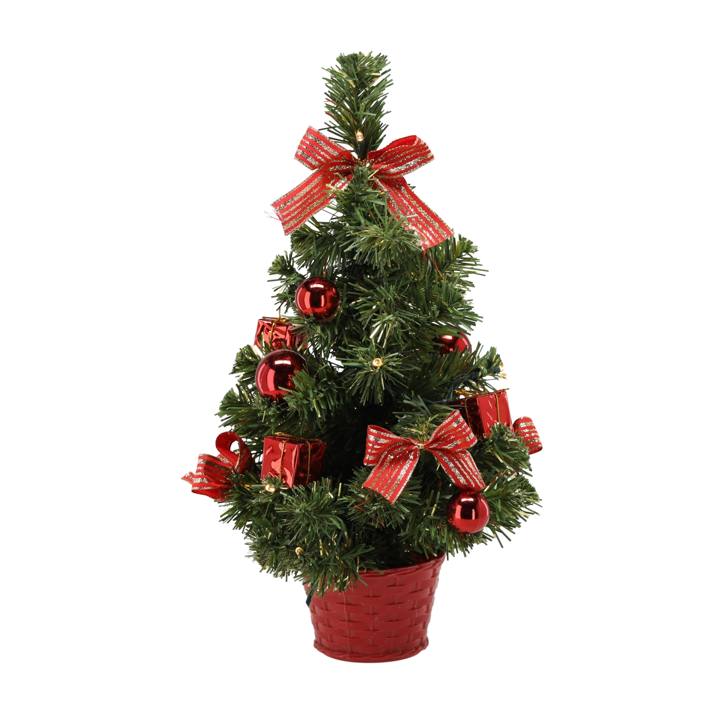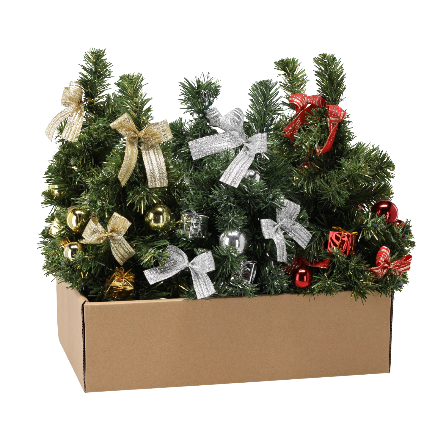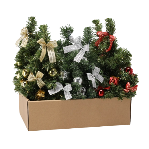 Stromček je doplnený mašličkami a guľôčkami v červených, strieborných či zlatých tónoch – stačí vybrať z obalu a vystaviť.