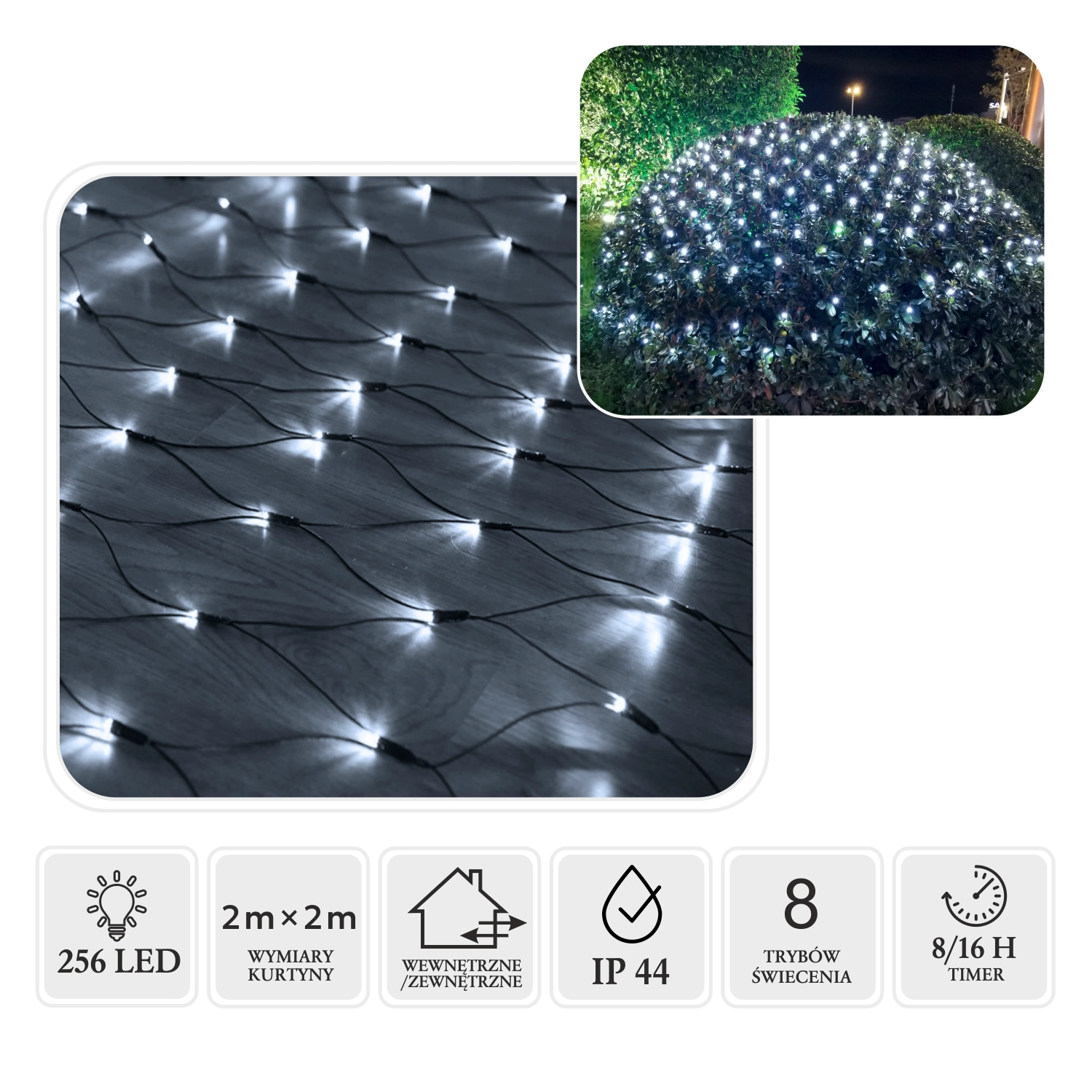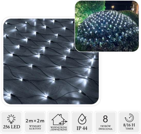Široká sieť 2 × 2 m s 256 LED vytvára súvislý, estetický svetelný závoj ideálny na fasády, balkóny či záhradné dekorácie.
