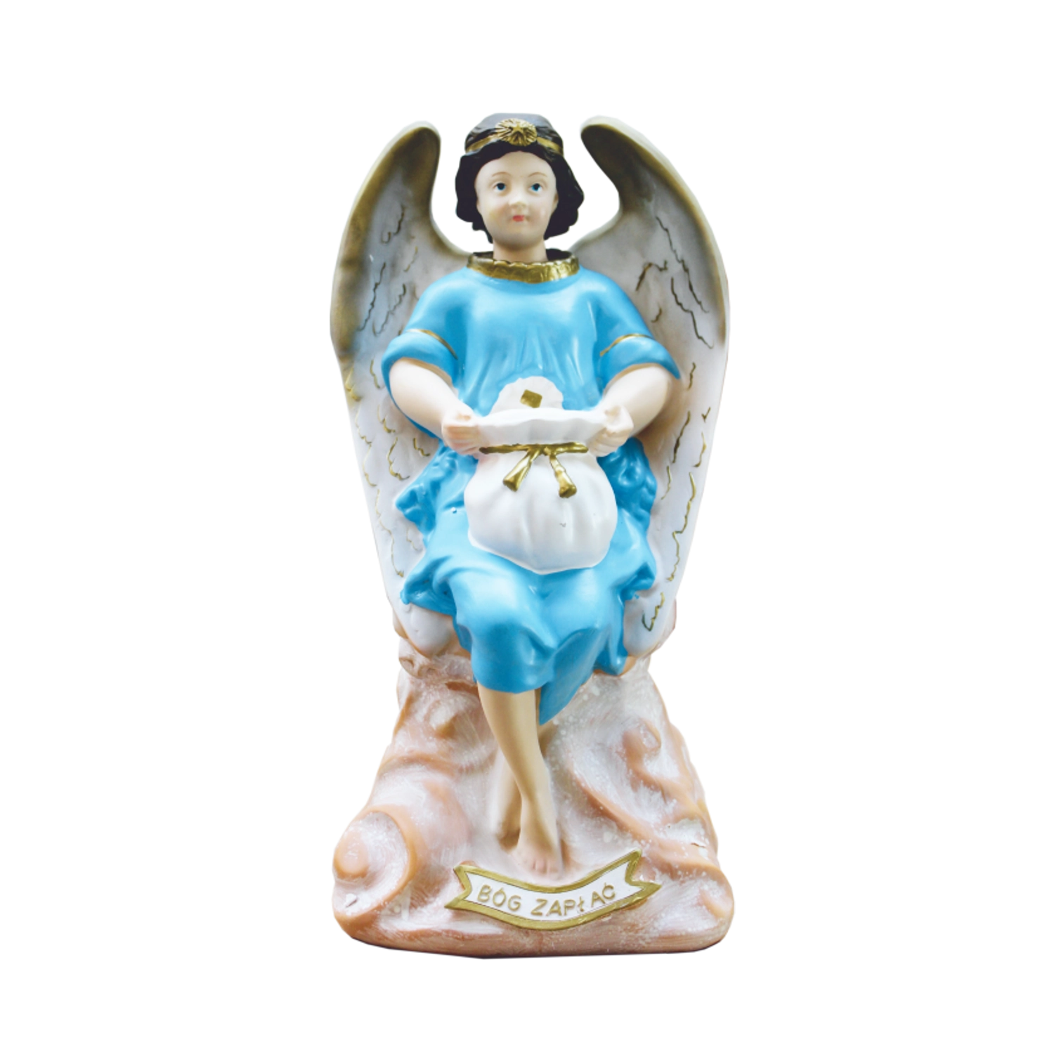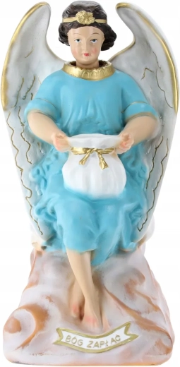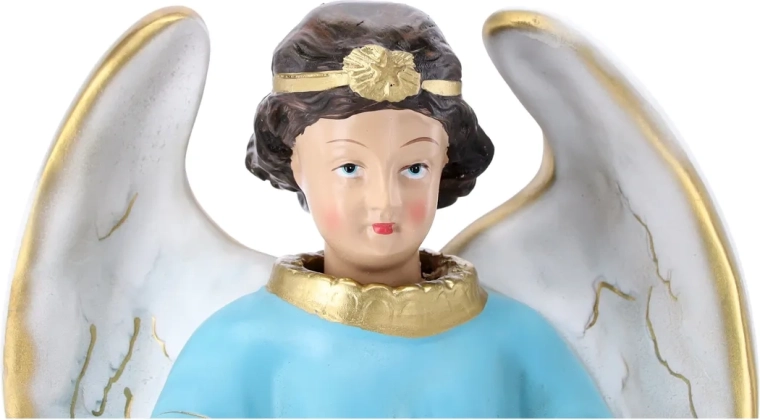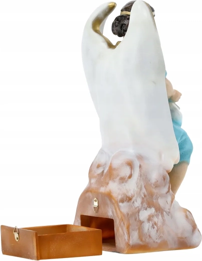 Elegantná soška anjela s jemnými bielymi krídlami a svetlomodrými šatami spája dekoratívnu krásu a praktickú funkciu pokladničky. Precízne maľované detaily, zlaté akcenty a odolný polyresin z nej robia ideálnu dekoráciu do bytu, kaplnky aj na sviatočný stôl či zmysluplný darček.
