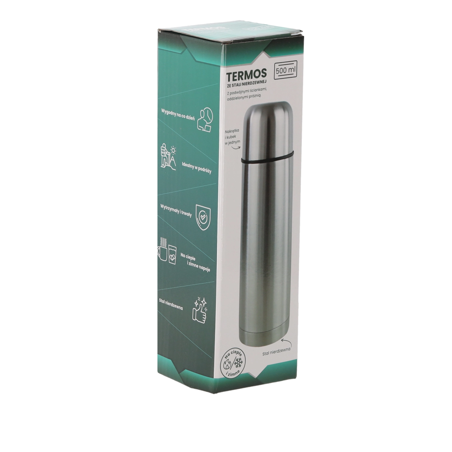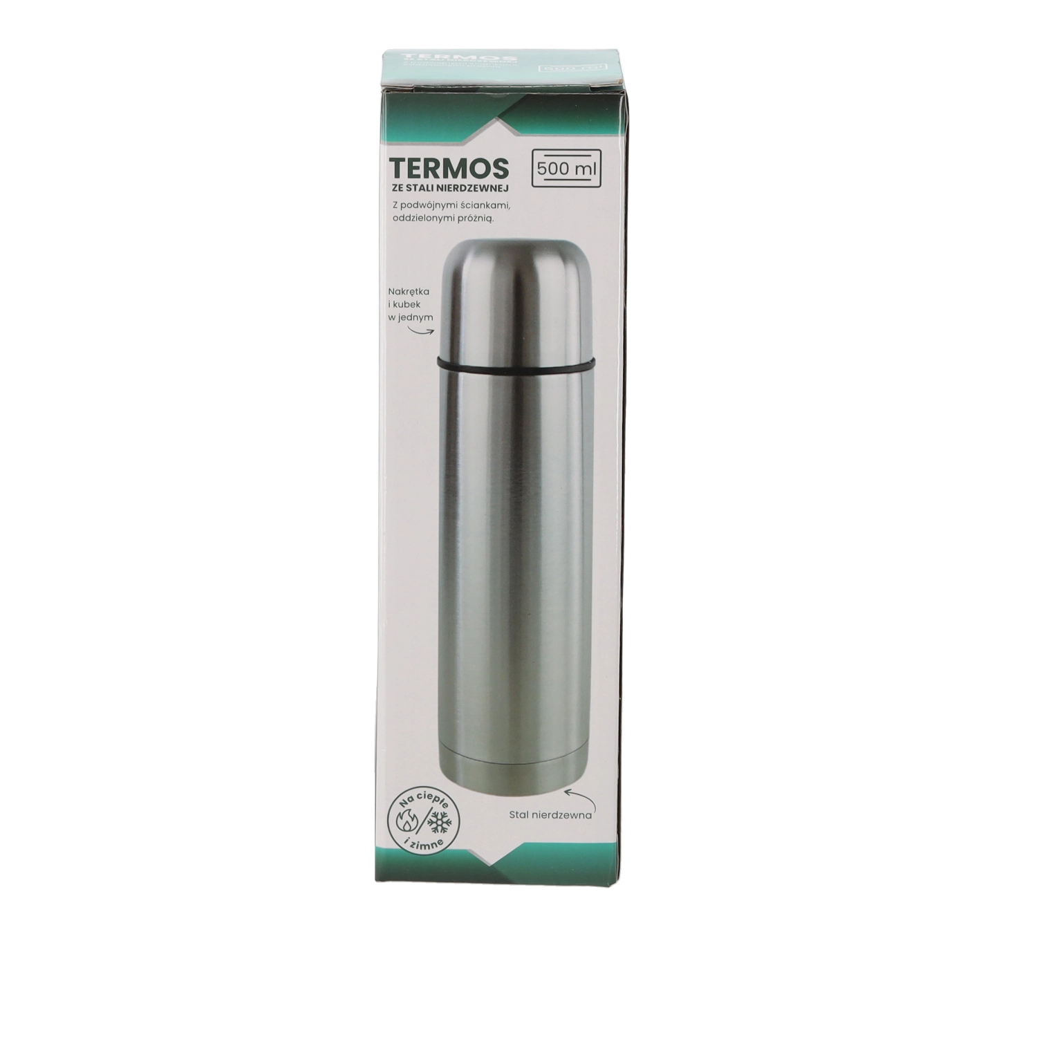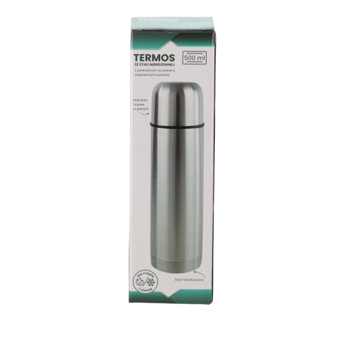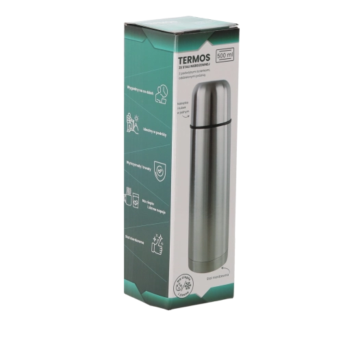 Praktický a odolný termos s objemom 500 ml s dvojitou stenou z nehrdzavejúcej ocele udrží nápoje dlho teplé aj studené. Vďaka kvalitnej izolácii si užijete teplotnú stabilitu až 24 hodín, kompaktné rozmery a nízku hmotnosť na každodenné použitie na cestách, v práci aj pri športe.