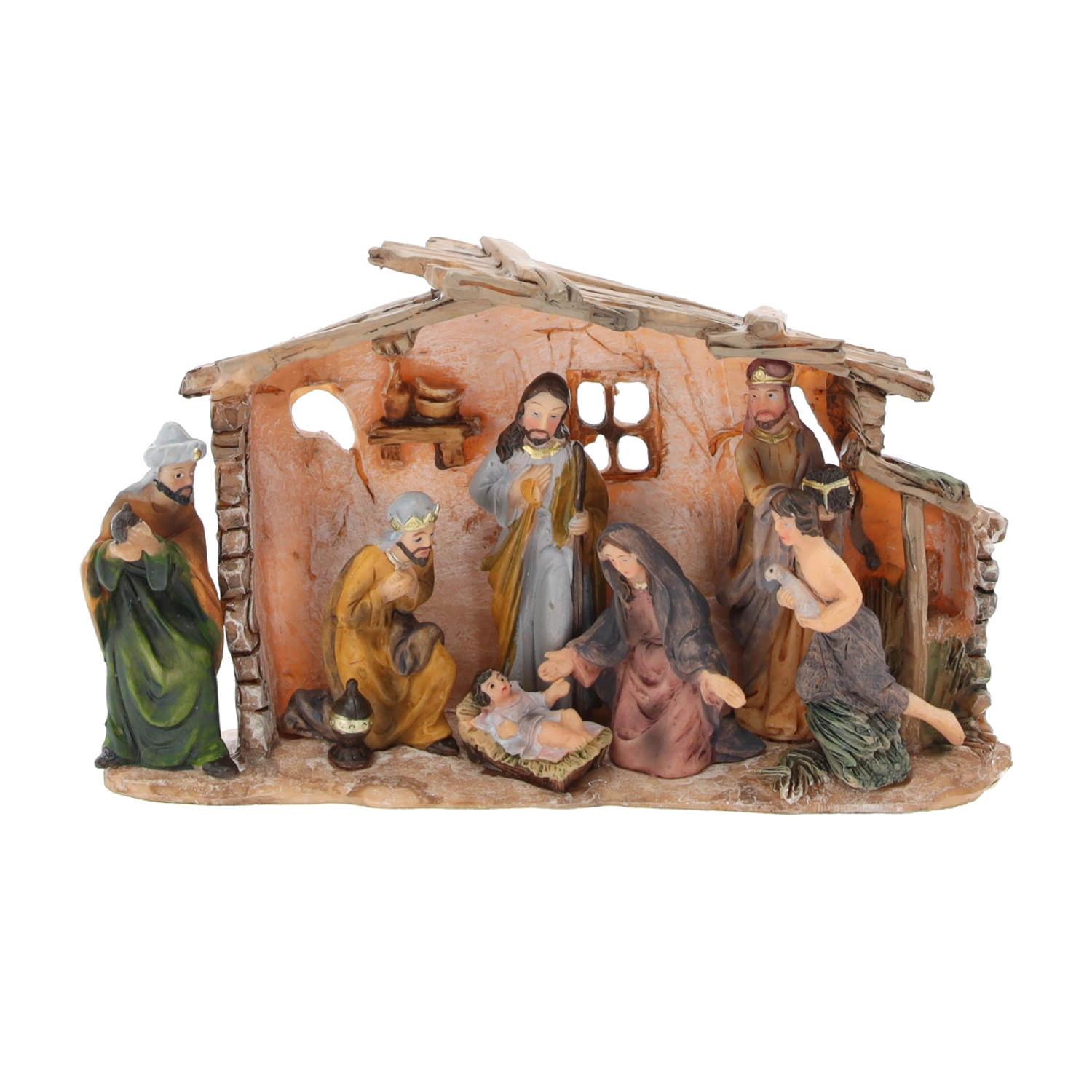 Prineste si domov kúzlo Vianoc s elegantným betlehemom, ktorý zobrazuje Svätú rodinu, pastierov a Traja kráľov pod rustikálnym chlievom. Figúrky sú detailne spracované a ručné maľované pre jedinečný vzhľad. Kompaktné rozmery robia z tejto dekorácie ideálnu vianočnú ozdobu na komodu, policu či krbovú rímsu. Odolná polyresínová živica zaistí dlhú životnosť a krásny vzhľad rok čo rok.