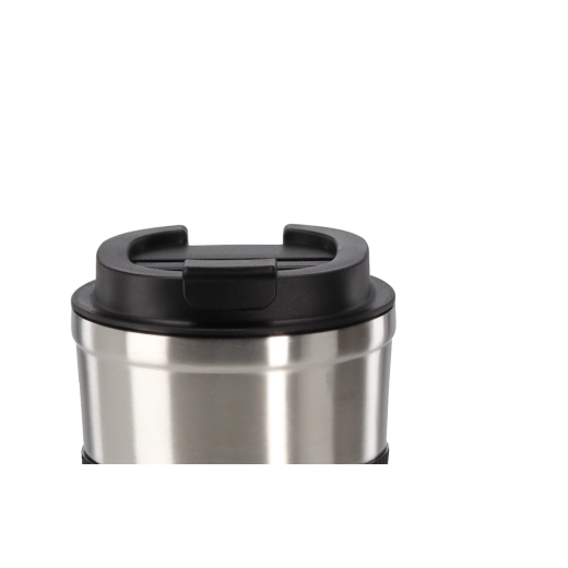 Štýlový cestovný termopohár v originálnom oceľovom prevedení je ideálny na horúcu kávu aj studené nápoje. Dvojitá stena s vákuovou konštrukciou pomáha dlhšie udržať požadovanú teplotu, zatiaľ čo textúrovaný silikónový pás zaisťuje bezpečný, nešmykľavý úchop.