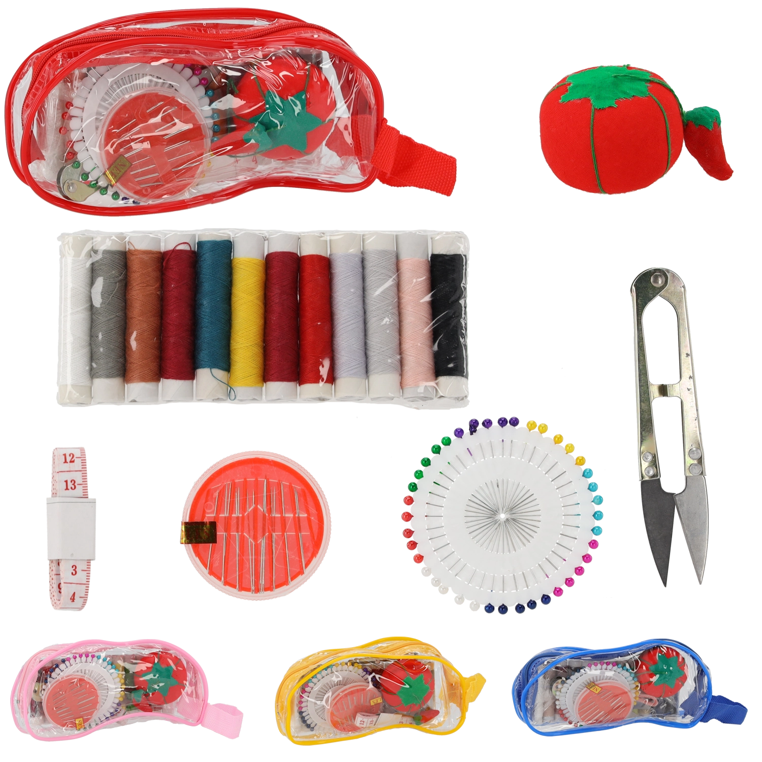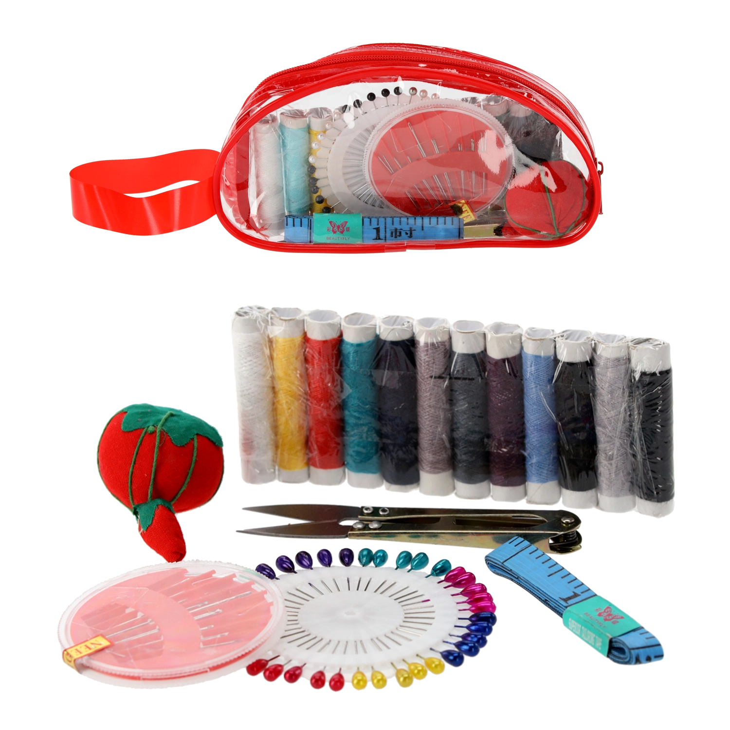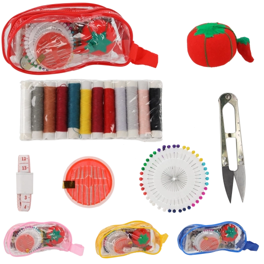 Praktická šijacia súprava so 6 základnými prvkami na rýchle opravy aj kreatívne šitie doma aj na cestách. Obsahuje 16 ihiel, krajčírsky meter 150 cm, nožnice, 12 cievok nití po 10 m v rôznych farbách, ihleniček a 40 špendlíkov s perlovými hlavičkami. Všetko je prehľadne uložené v priehľadnom puzdre so zipsom na jednoduché prenášanie a organizáciu.