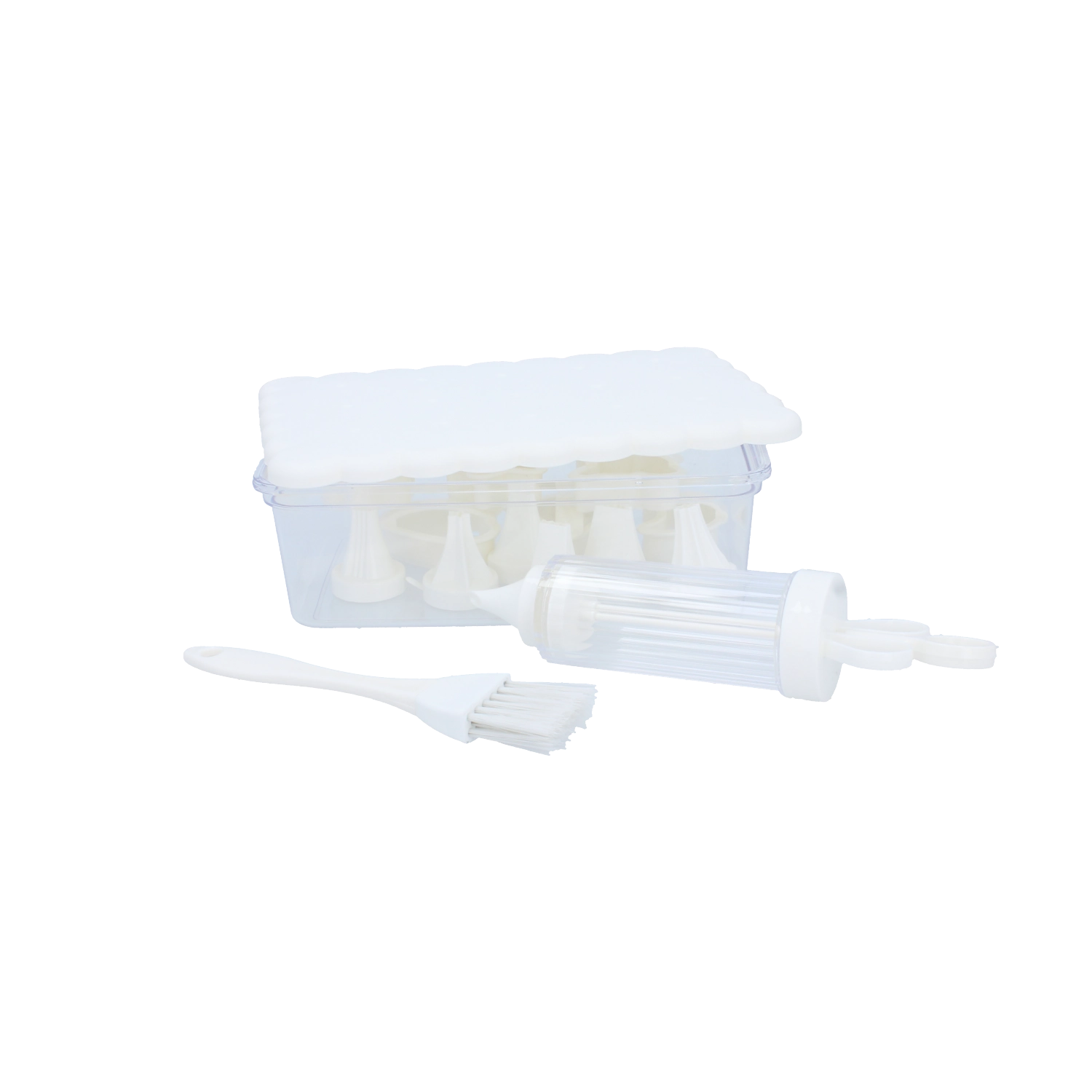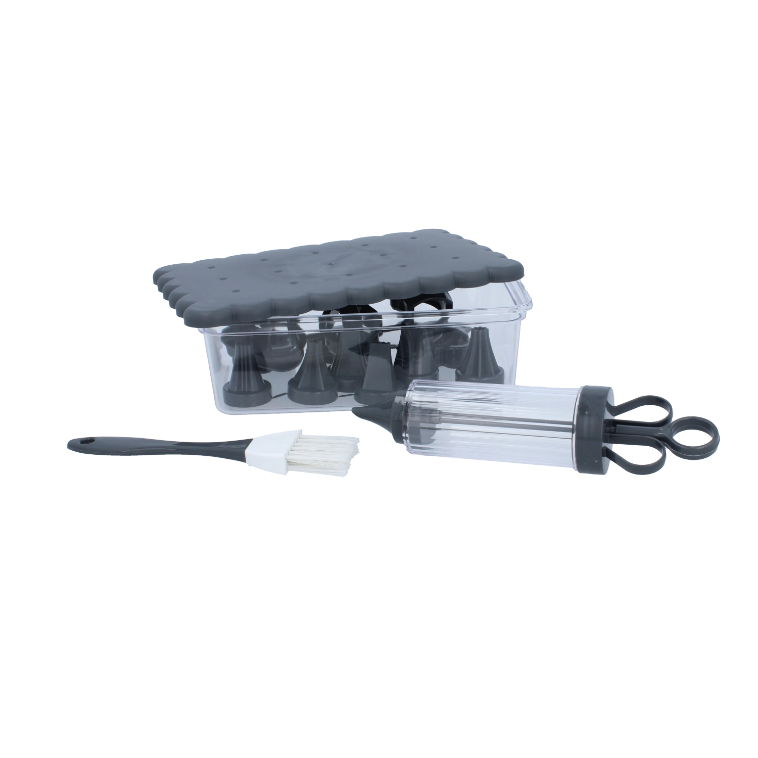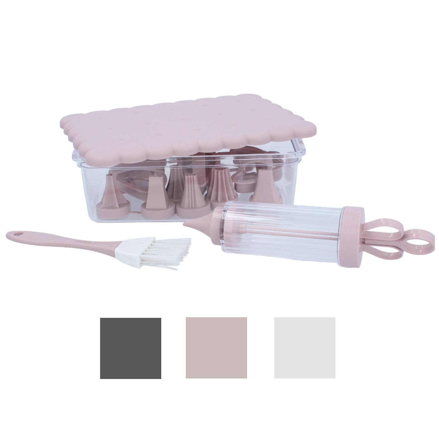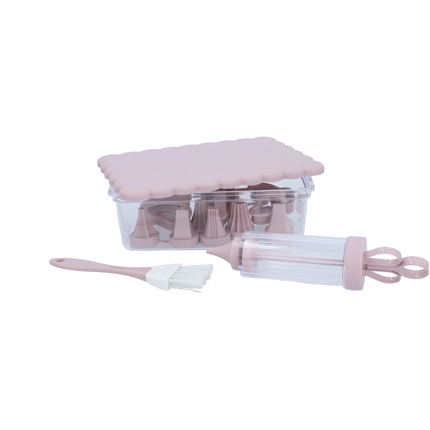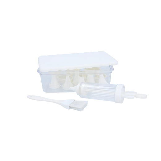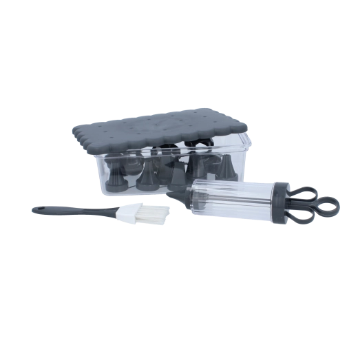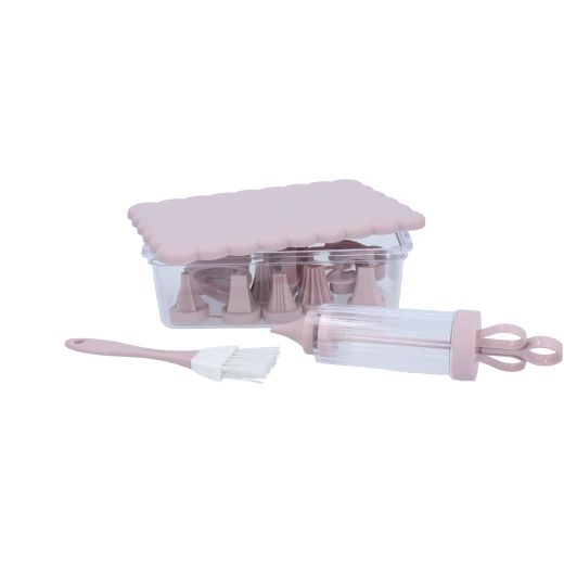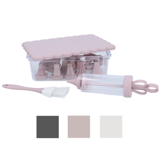 Kompletná cukrárska sada na domáce pečenie a kreatívne zdobenie. Obsahuje 16 praktických dielov, vrátane vykrajovačiek na sušienky, zdobiacej striekačky s vymeniteľnými koncovkami, štetčeka a uzatvárateľnej dózy na jednoduché skladovanie. Ideálna pre začiatočníkov aj nadšených pekárov, ktorí chcú vytvárať precízne dekorácie a krásne tvarované pečivo.