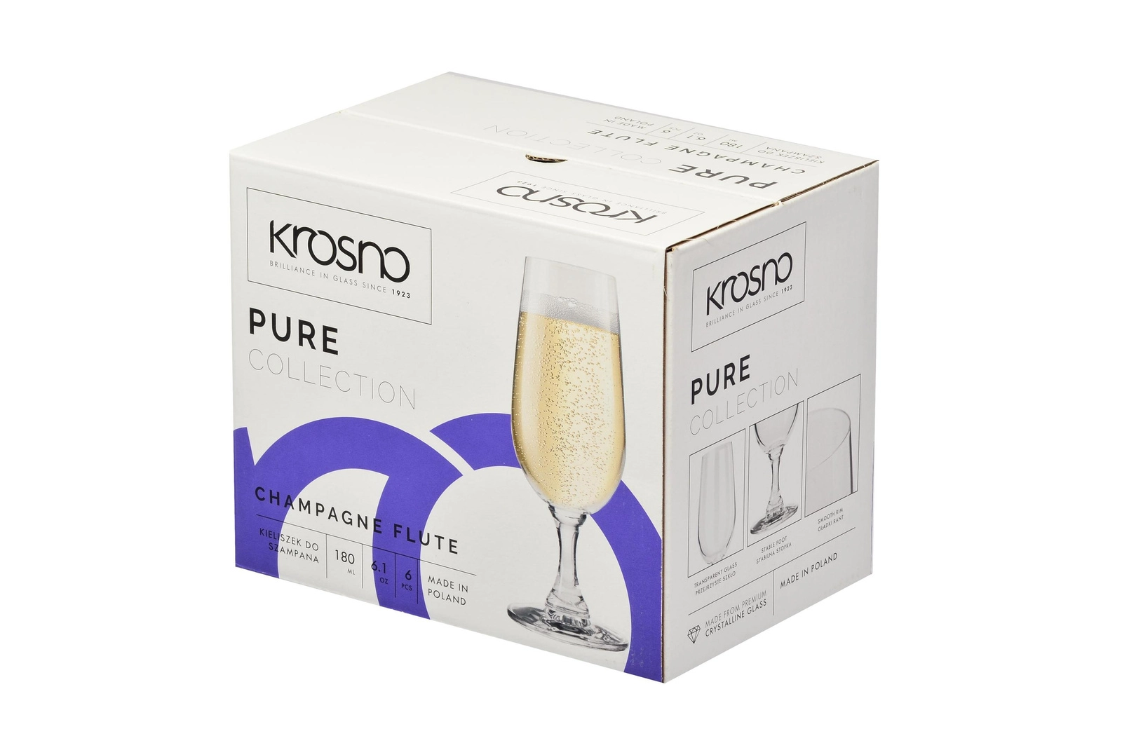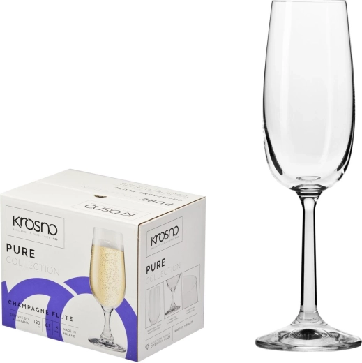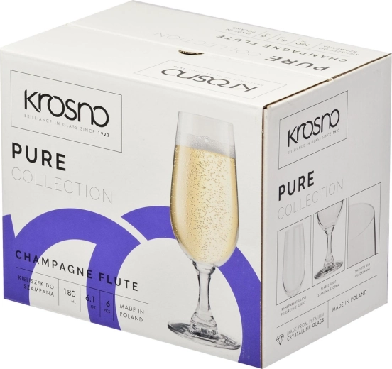Elegantná sada šiestich pohárov na šampanské z kolekcie PURE od značky Krosno poteší svojím čistým dizajnom a špičkovým spracovaním. Poháre z bezolovnatého skla Crystalline vynikajú výnimočnou priezračnosťou, odolnosťou proti poškriabaniu a klasickým tvarom flute, ktorý podporuje jemné uvoľňovanie bubliniek a predlžuje zážitok z pitia šampanského. Sú vhodné do umývačky riadu a ideálne na oslavy, svadby aj domáce degustácie.